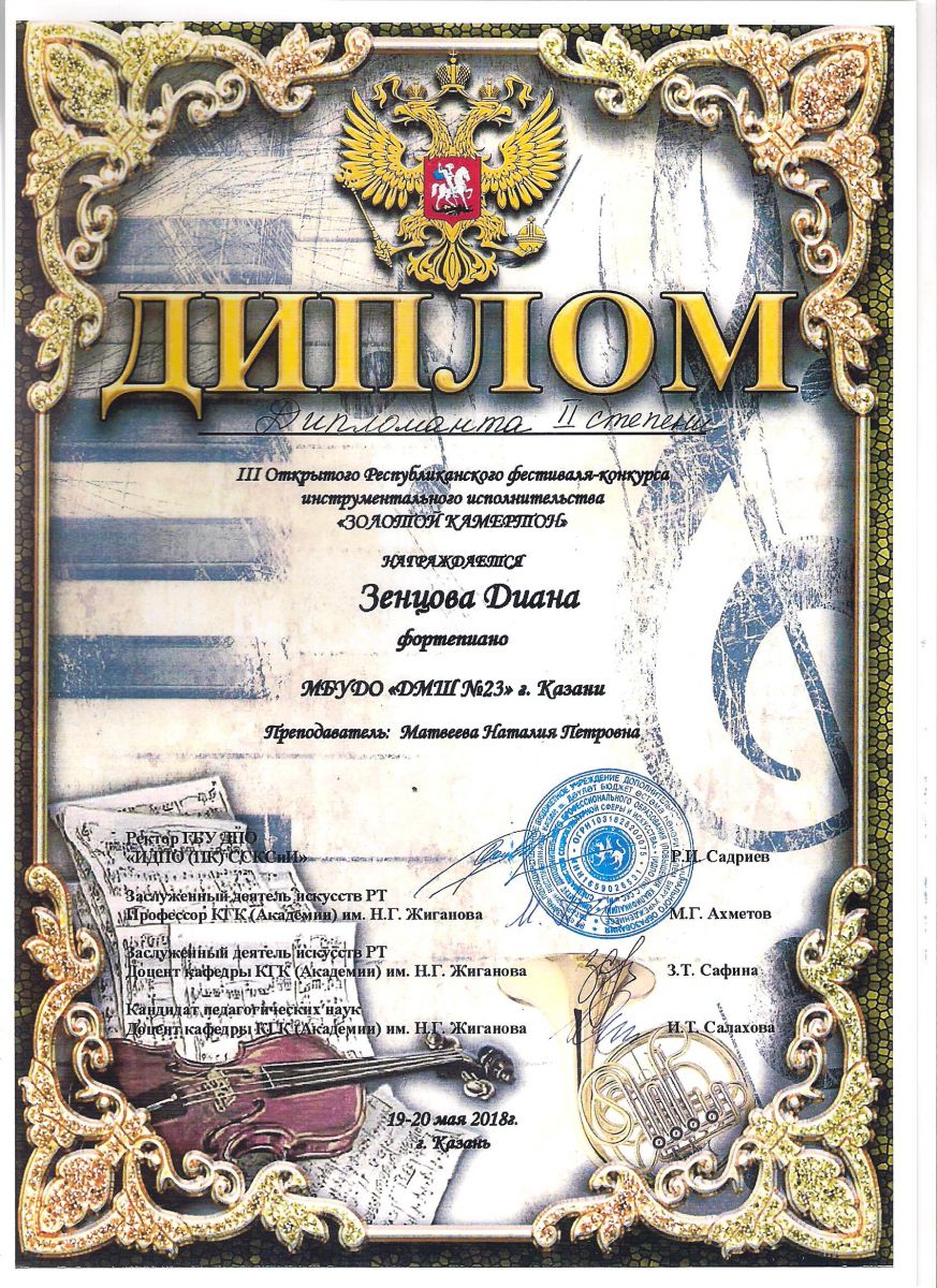 III Открытый Республиканский фестиваль-конкурс инструментального исполнительства "Золотой камертон" - Диплом дипломанта 2 степени - Зенцова Диана (преподаватель: Матвеева Н.П.)