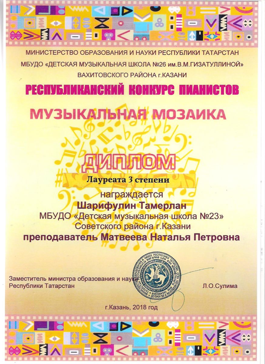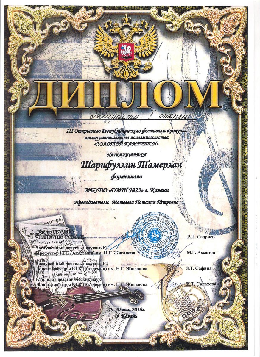 III Открытый Республиканский фестиваль-конкурс инструментального исполнительства "Золотой камертон" - Диплом лауреата 1 степени - Шарифулин Тамерлан (преподаватель: Матвеева Н.П.)