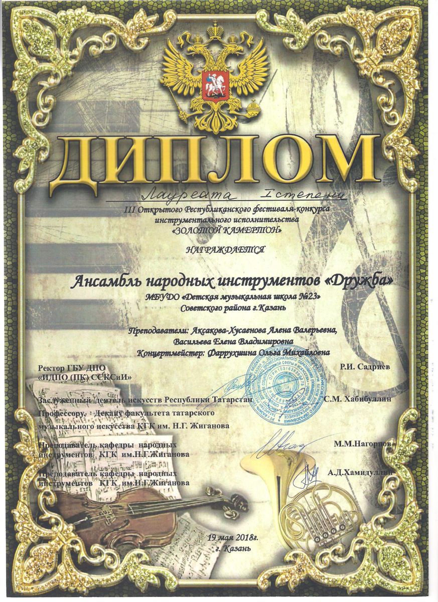 III Открытый Республиканский фестиваль-конкурс инструментального исполнительства "Золотой камертон" - Диплом лауреата 1 степени - Ансамбль струнных народных инструментов "Дружба" (руководители: Аксакова-Хусаенова А.В., Васильева Е.В., концертмейстер: Фаррухшина О.М.)