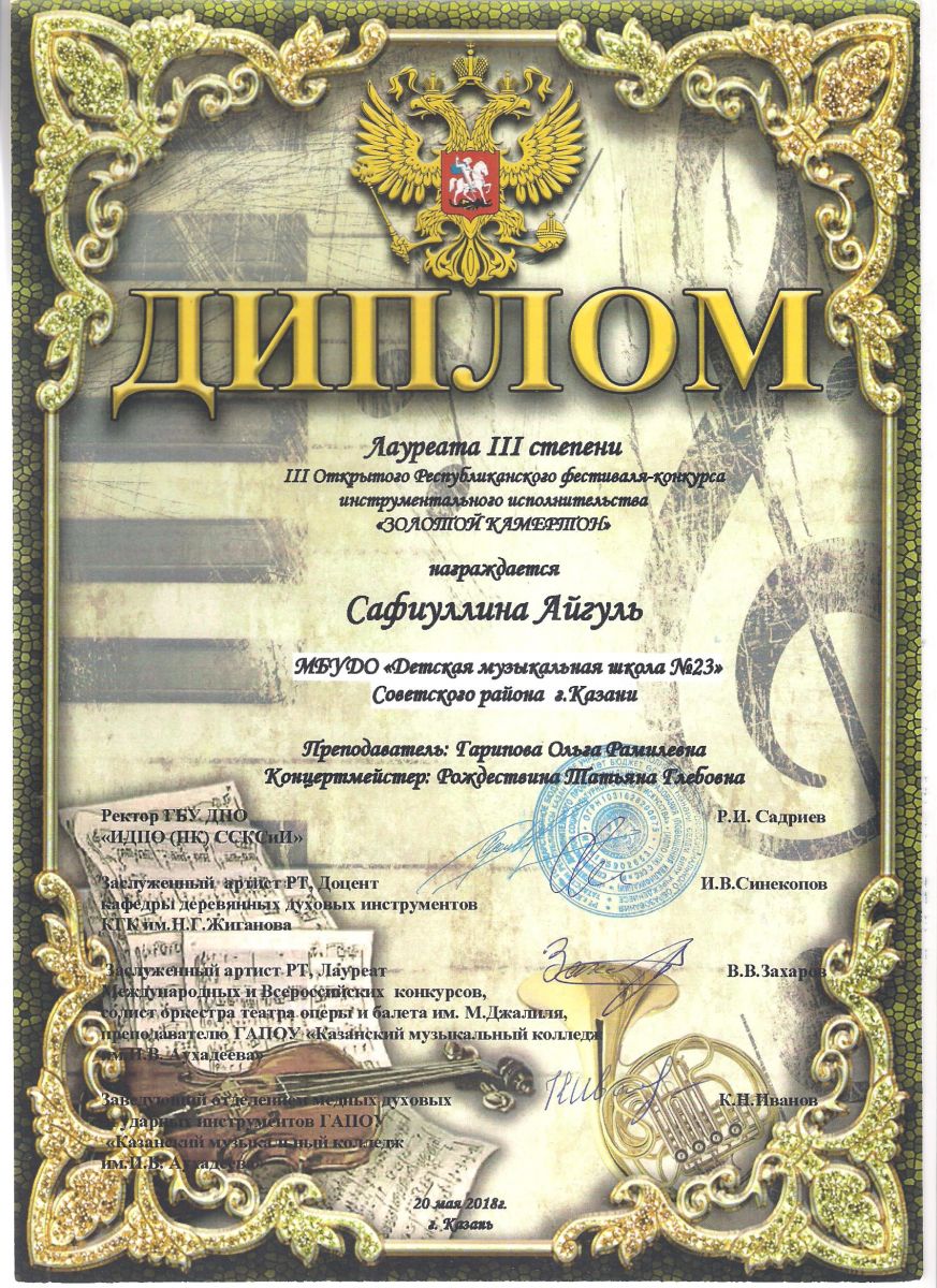 III Открытый Республиканский фестиваль-конкурс инструментального исполнительства "Золотой камертон" - Диплом лауреата 3 степени - Сафиуллина Айгуль (преподаватель: Гарипова О.Р., концертмейстер: Рождествина Т.Г.)