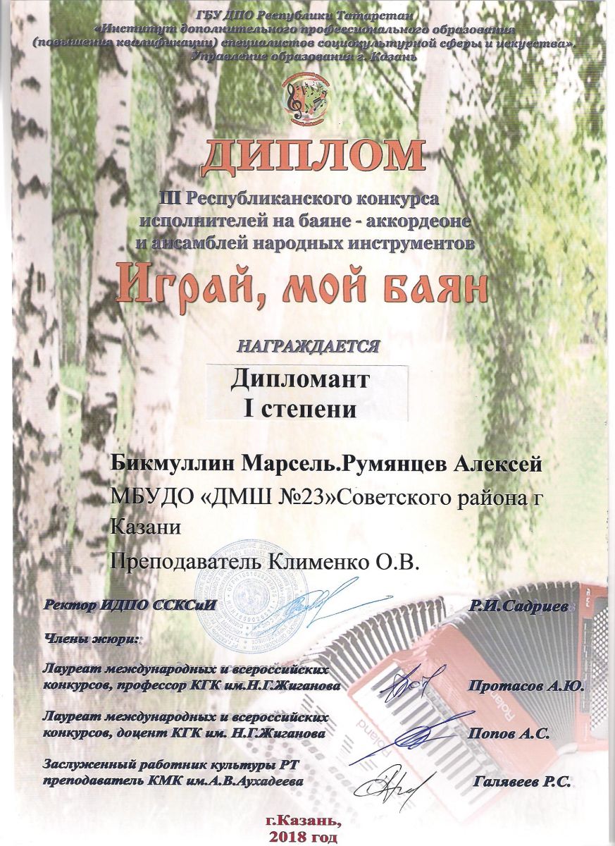 III Республиканский конкурс исполнителей на баяне-аккордеоне и ансамблей народных инструментов "Играй, мой баян" - Дипломант 1 степени - Бикмуллин Марсель, Румянцев Алексей (преподаватель: Клименко О.В.)