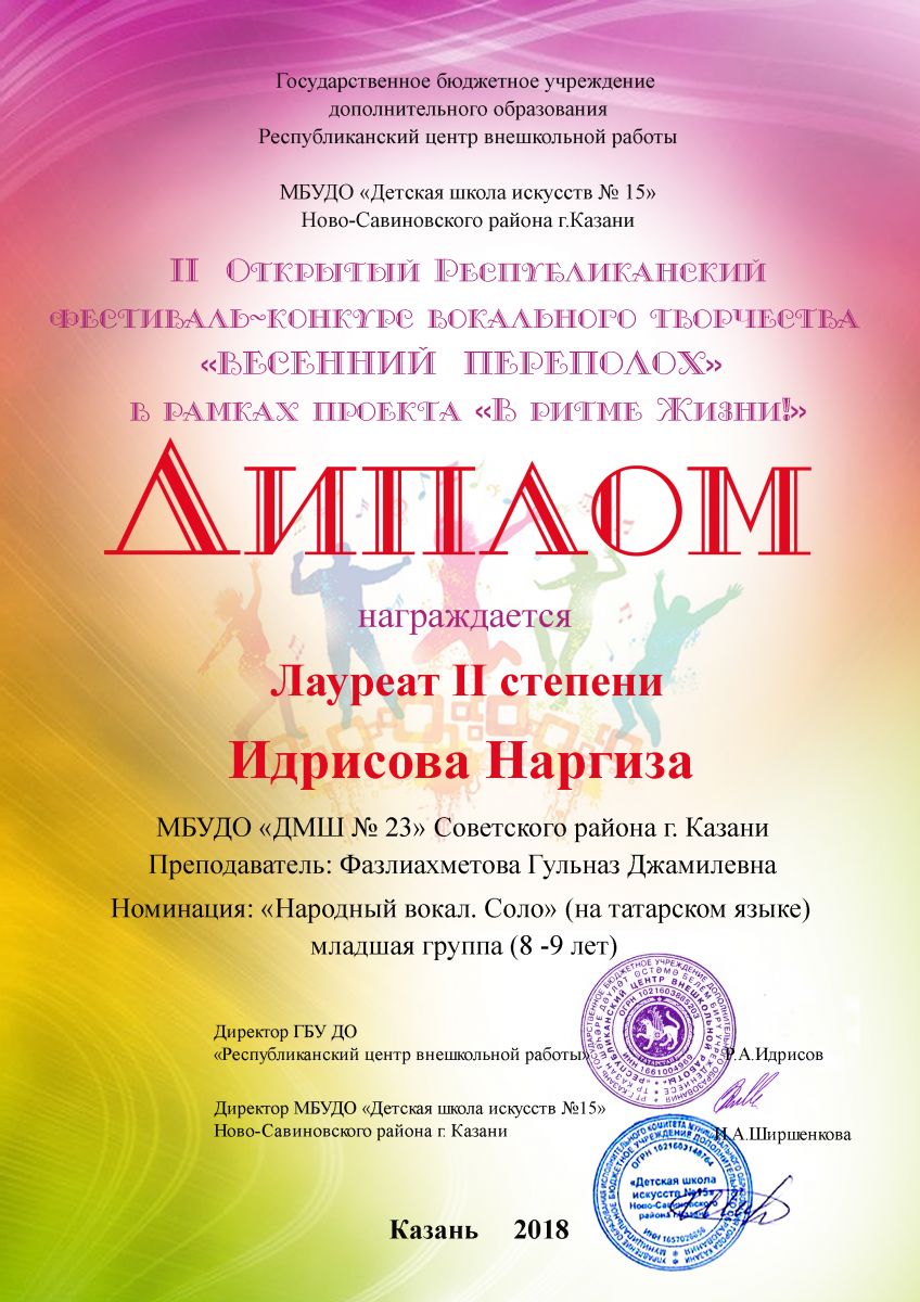 II Открытый Республиканский фестиваль-конкурс вокального творчества "Весенний переполох" - Диплом лауреата 2 степени - Идрисова Наргиза (преподаватель: Фазлиахметова Г.Д.)