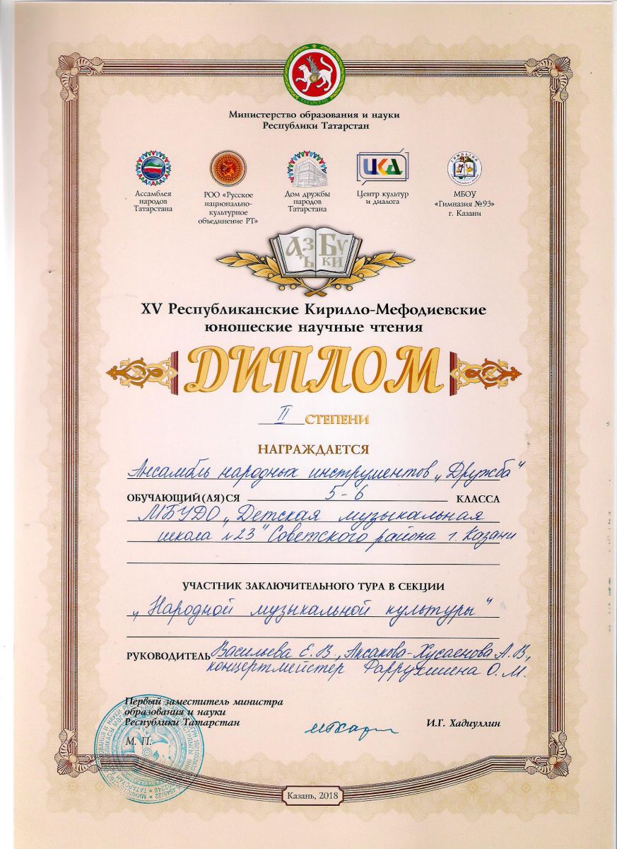 XV Республиканские Кирилло-Мефодиевские юношеские научные чтения - Секция народной музыкальной культуры - Диплом 2 степени - Ансамбль народных инструментов "Дружба" (руководители: Аксакова-Хусаенова А.В., Васильева Е.В., концертмейстер: Фаррухшина О.М.)