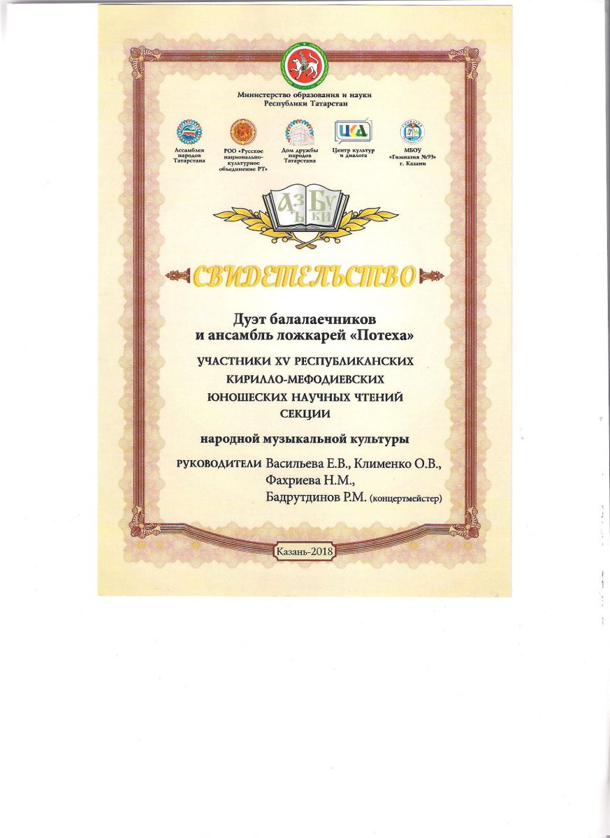 XV Республиканские Кирилло-Мефодиевские юношеские научные чтения - Секция народной музыкальной культуры - Свидетельство - Дуэт балалаечников и ансамбль ложкарей "Потеха" (руководители: Васильева Е.В., Клименко О.В., Фахриева Н.М., концертмейстер: Бадрутдинов Р.М.)