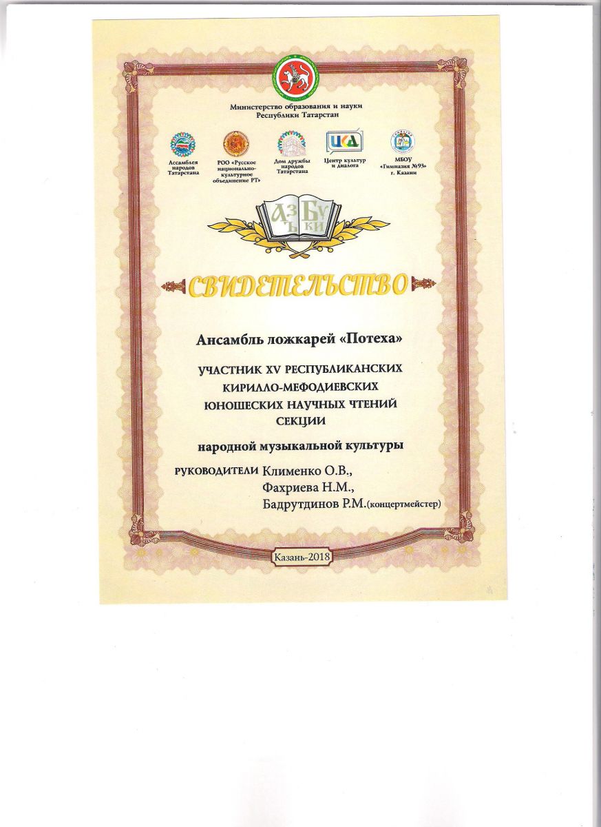 XV Республиканские Кирилло-Мефодиевские юношеские научные чтения - Секция народной музыкальной культуры - Свидетельство - Ансамбль ложкарей "Потеха" (руководители: Клименко О.В., Фахриева Н.М., концертмейстер: Бадрутдинов Р.М.)