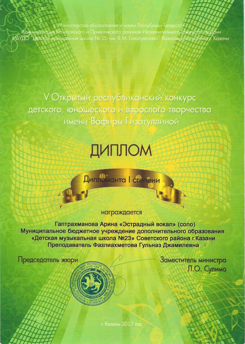 V Открытый Республиканский конкурс детского, юношеского и взрослого творчества имени Вафиры Гизатуллиной - Диплом дипломанта 1 степени - Гаптрахманова Арина (преподаватель: Фазлиахметова Г.Д.)