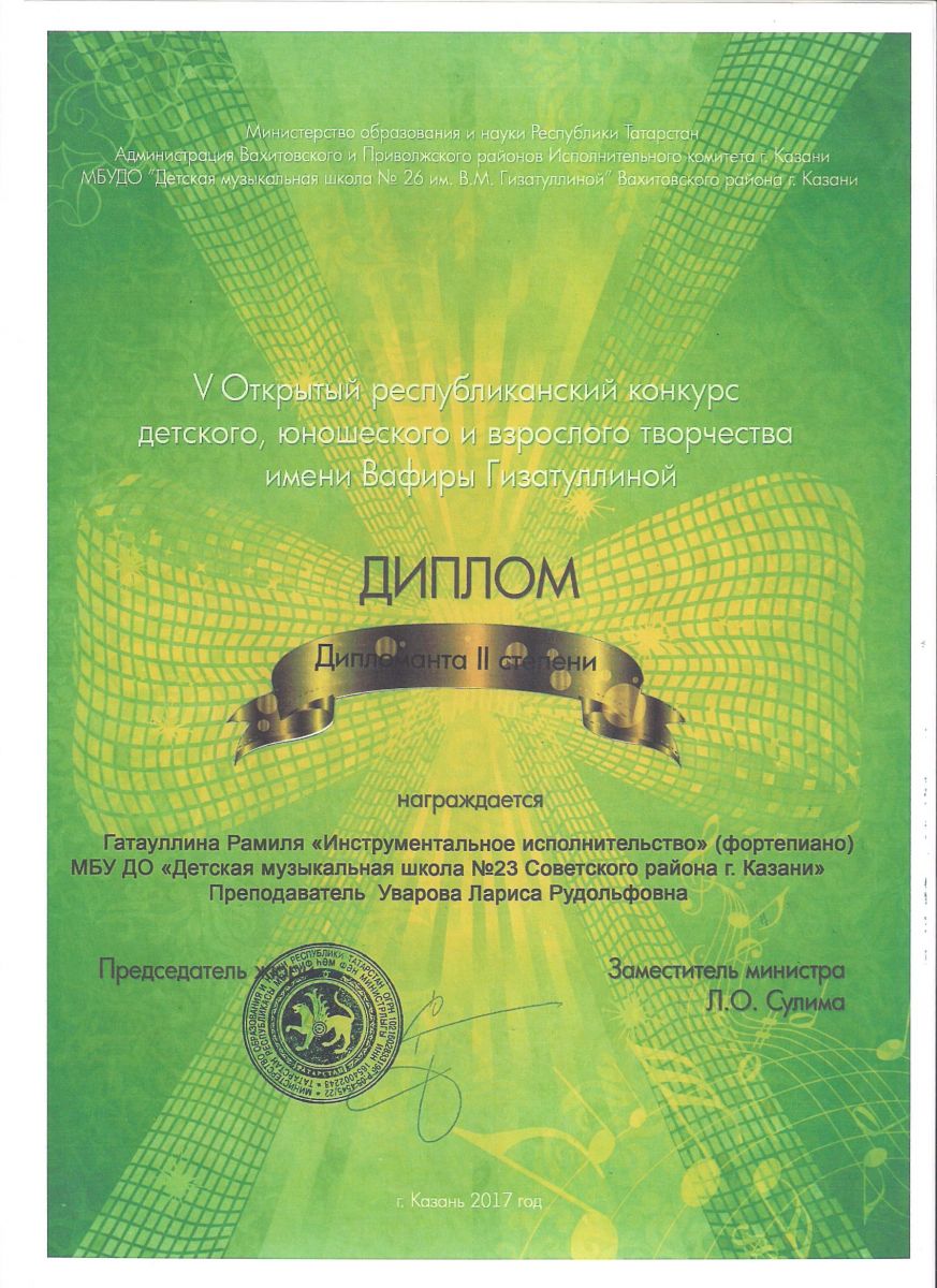 V Открытый Республиканский конкурс детского, юношеского и взрослого творчества имени Вафиры Гизатуллиной - Диплом дипломанта 2 степени - Гатауллина Рамиля (преподаватель: Уварова Л.Р.)