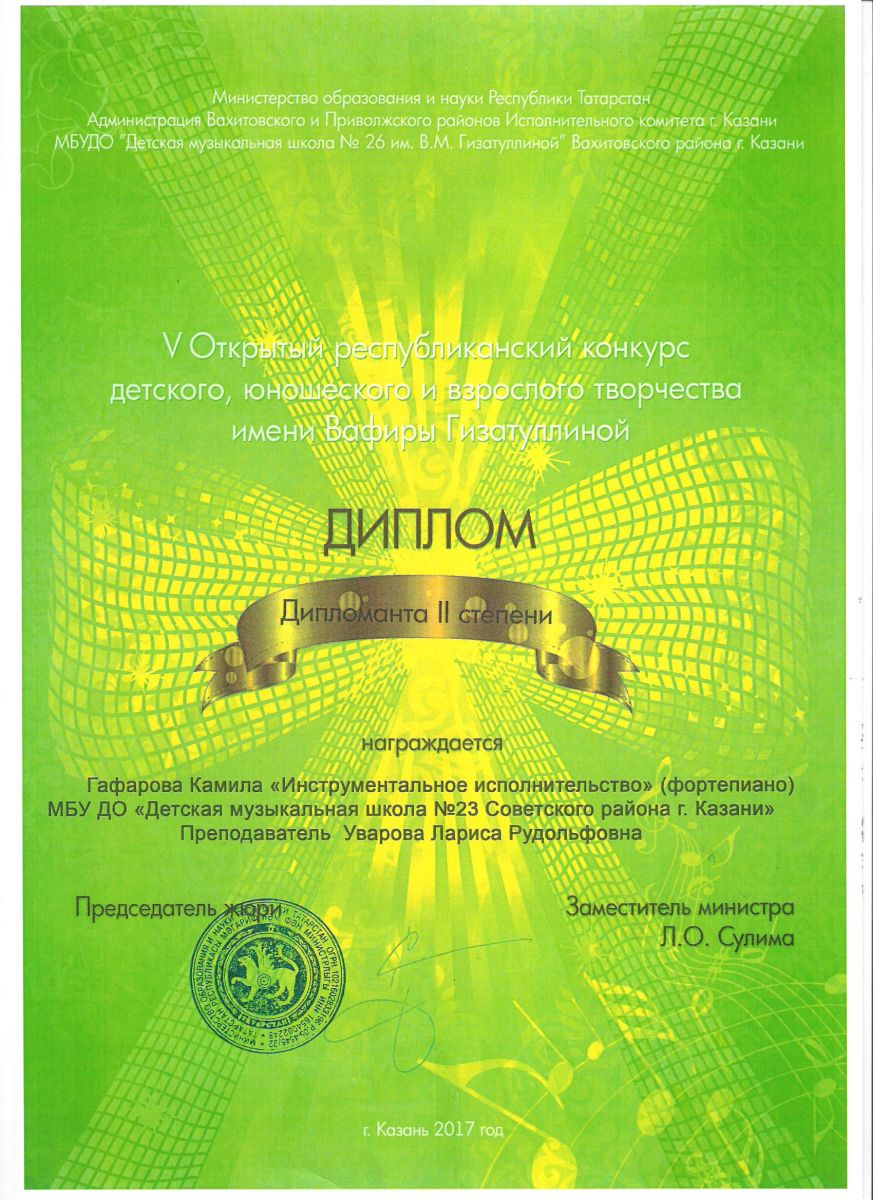 V Открытый Республиканский конкурс детского, юношеского и взрослого творчества имени Вафиры Гизатуллиной - Диплом дипломанта 2 степени - Гафарова Камила (преподаватель: Уварова Л.Р.)