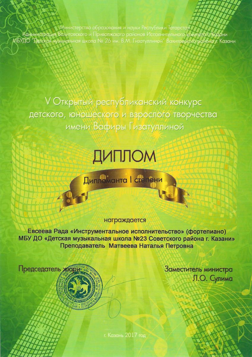 V Открытый Республиканский конкурс детского, юношеского и взрослого творчества имени Вафиры Гизатуллиной - Диплом дипломанта 1 степени - Евсеева Рада (преподаватель: Матвеева Н.П.)