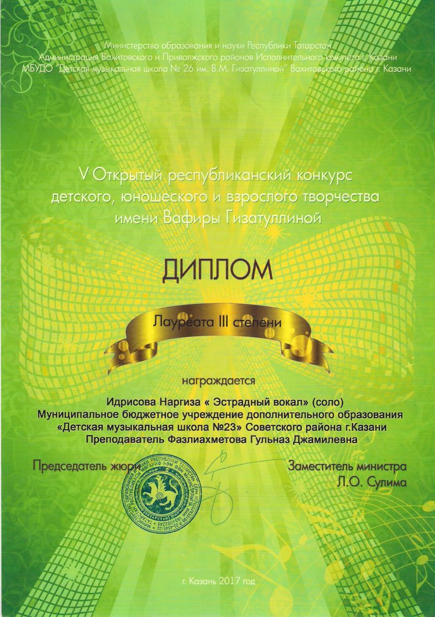 V Открытый Республиканский конкурс детского, юношеского и взрослого творчества имени Вафиры Гизатуллиной - Диплом лауреата 3 степени - Идрисова Наргиза (преподаватель: Фазлиахметова Г.Д.)