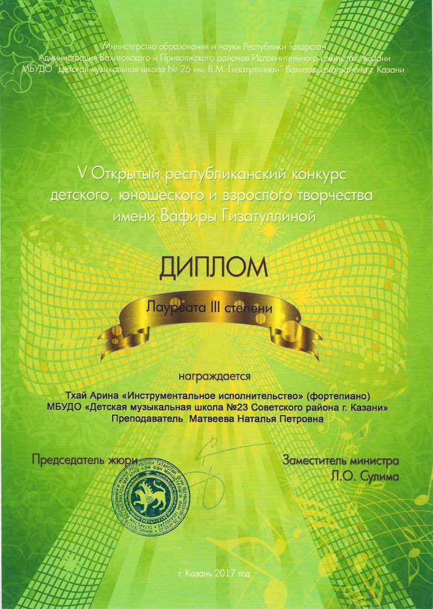 V Открытый Республиканский конкурс детского, юношеского и взрослого творчества имени Вафиры Гизатуллиной - Диплом лауреата 3 степени - Тхай Арина (преподаватель: Матвеева Н.П.)