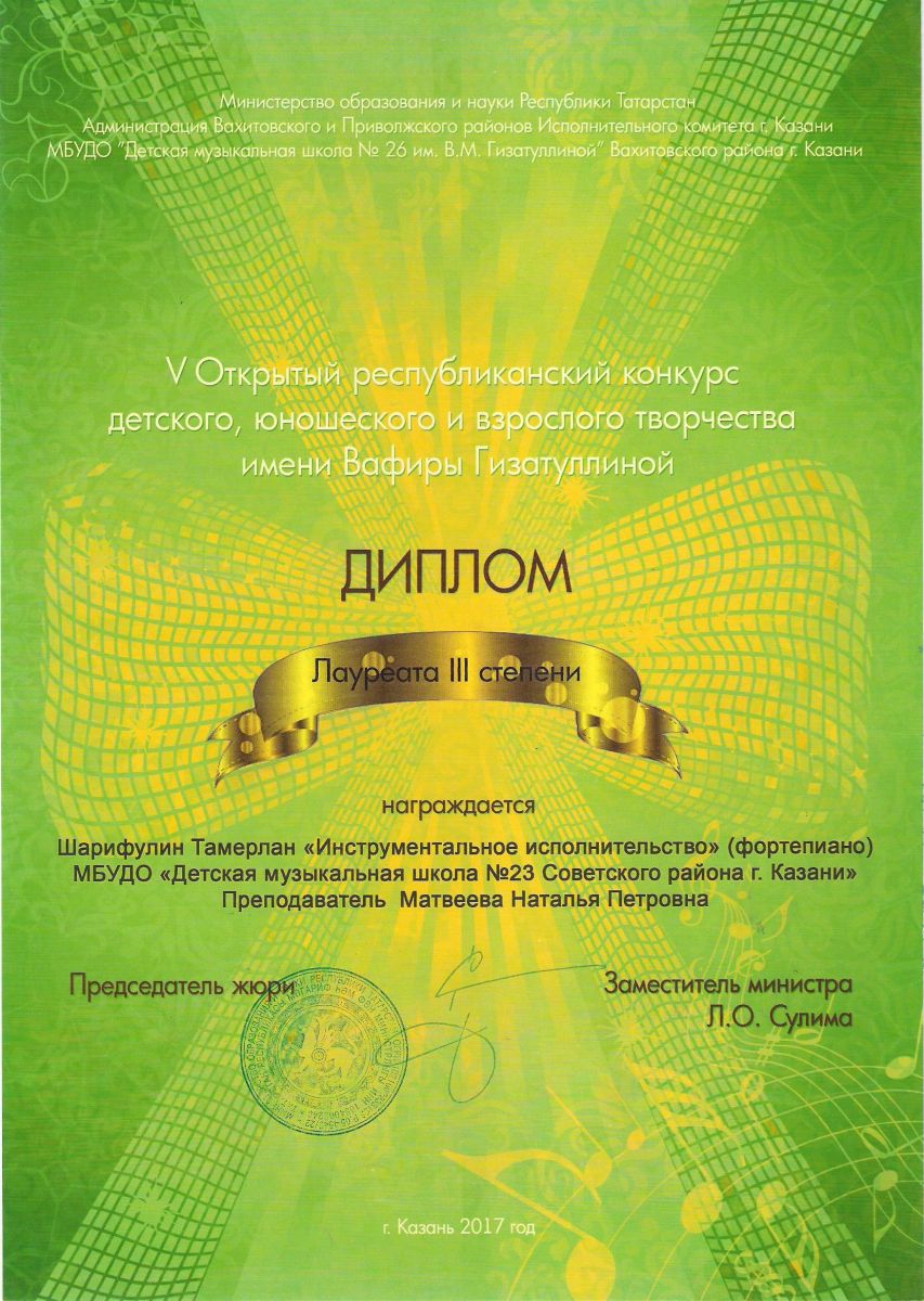 V Открытый Республиканский конкурс детского, юношеского и взрослого творчества имени Вафиры Гизатуллиной - Диплом лауреата 3 степени - Шарифулин Тамерлан (преподаватель: Матвеева Н.П.)