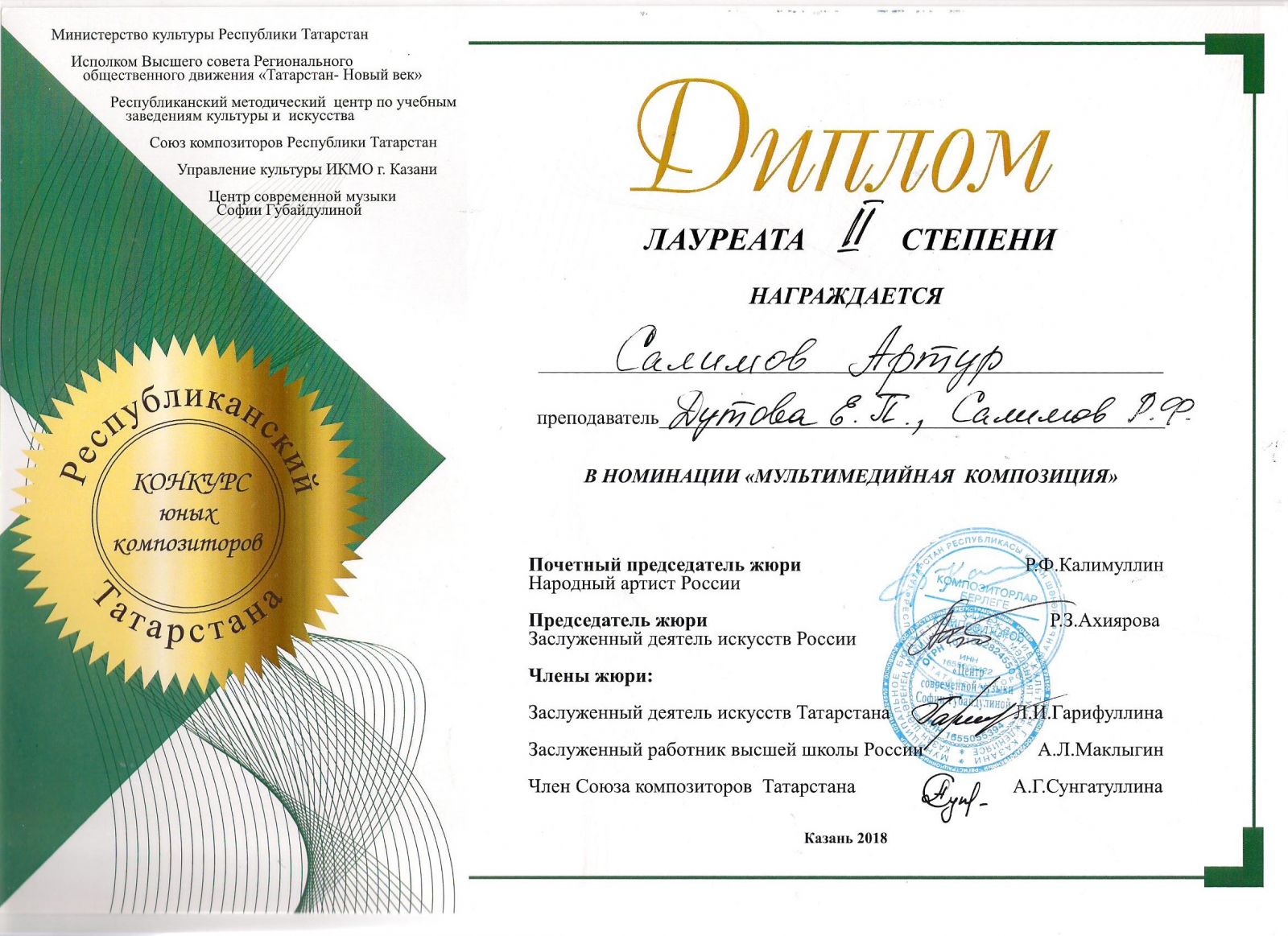 Республиканский конкурс юных композиторов Татарстана - Диплом лауреата 2 степени - Салимов Артур (преподаватель: Дутова Е.П.)