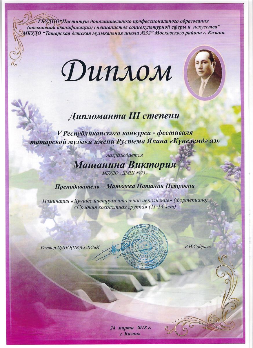 V Республиканский конкурс-фестиваль татарской музыки имени Рустема Яхина "Кунелемдэ яз" - Диплом дипломанта 3 степени - Машанина Виктория (преподаватель: Матвеева Н.П.)