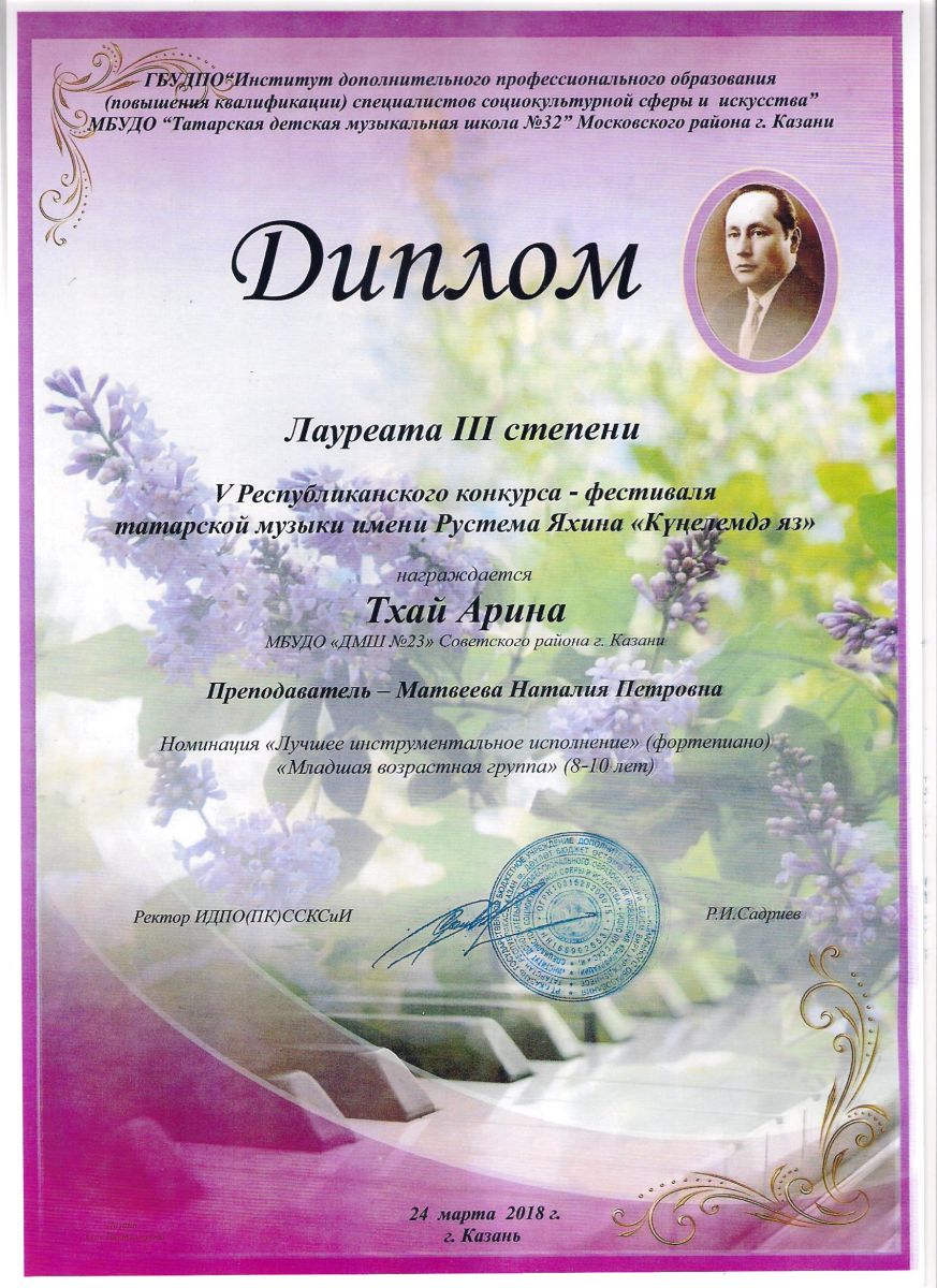V Республиканский конкурс-фестиваль татарской музыки имени Рустема Яхина "Кунелемдэ яз" - Диплом лауреата 3 степени - Тхай Арина (преподаватель: Матвеева Н.П.)