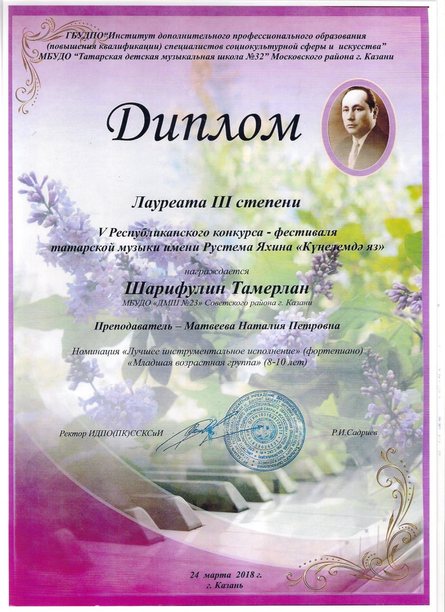 V Республиканский конкурс-фестиваль татарской музыки имени Рустема Яхина "Кунелемдэ яз" - Диплом лауреата 3 степени - Шарифулин Тамерлан (преподаватель: Матвеева Н.П.)