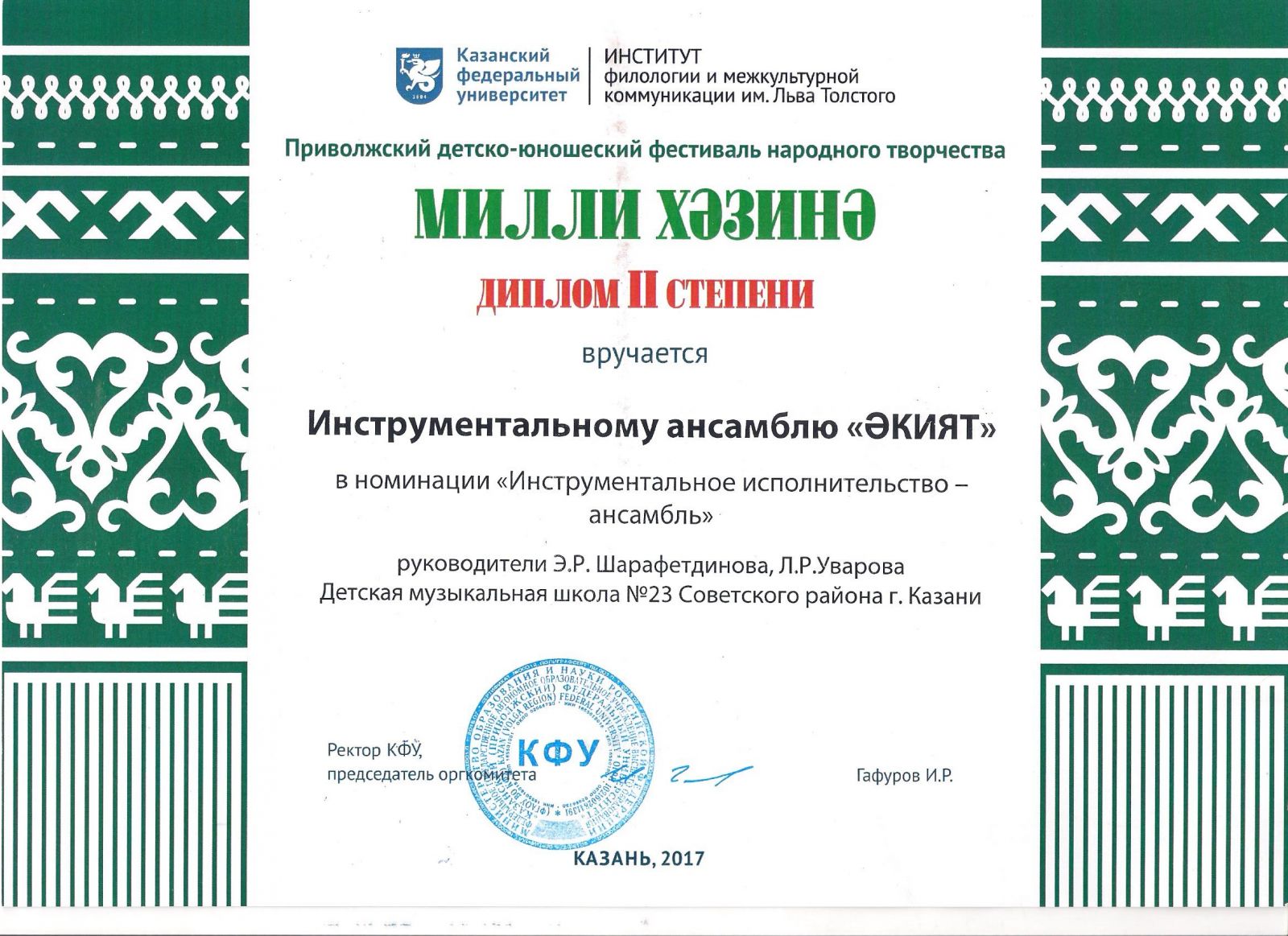 Приволжский детско-юношеский фестиваль народного творчества "Милли хәзинә" - Диплом 2 степени - Ансамбль "Экият" (руководители: Шарафетдинова Э.Р., Уварова Л.Р.)
