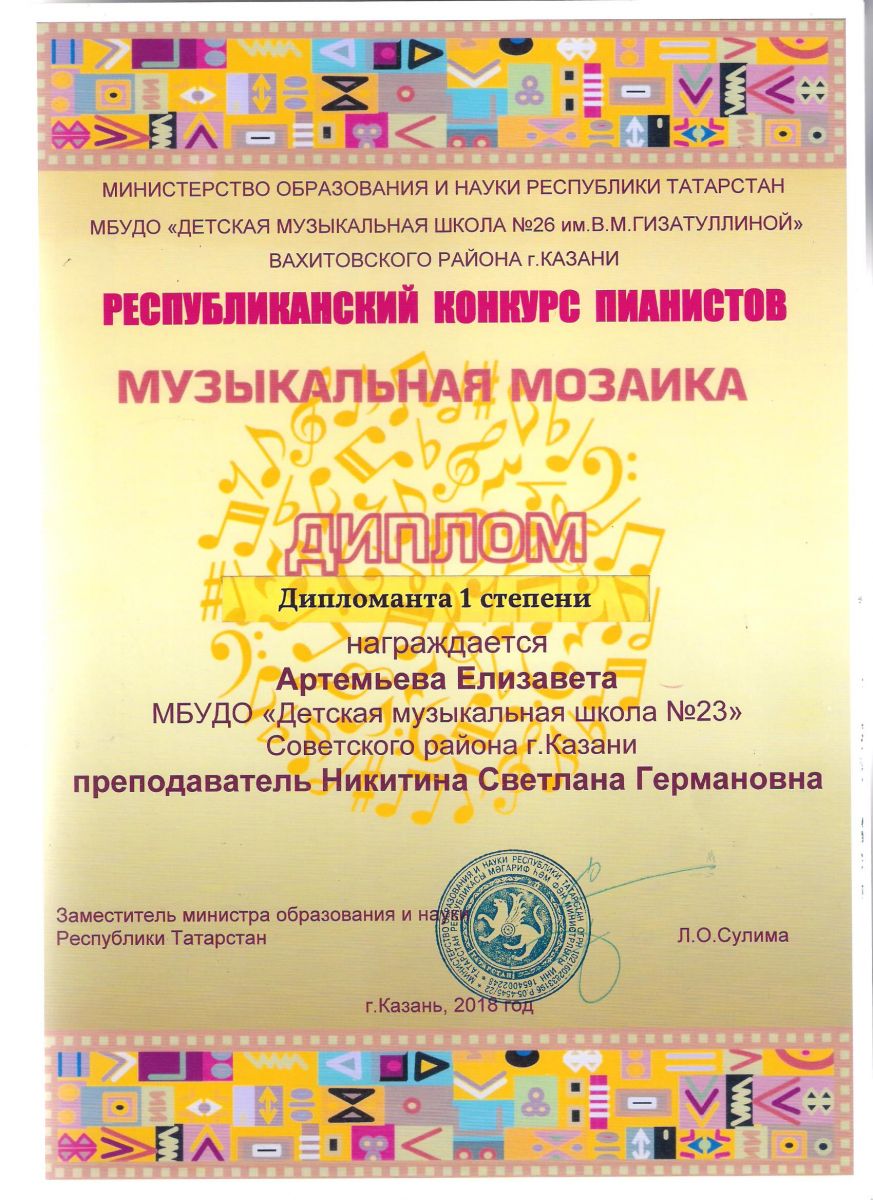 Республиканский конкурс пианистов "Музыкальная мозаика" - Диплом дипломанта 1 степени - Артемьева Елизавета (преподаватель: Никитина С.Г.)