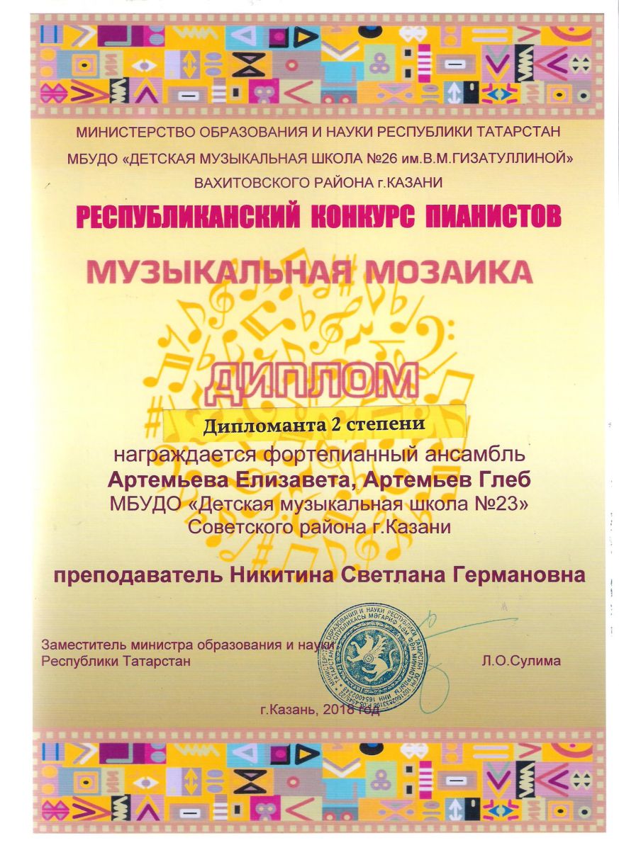 Республиканский конкурс пианистов "Музыкальная мозаика" - Диплом дипломанта 2 степени - фортепианный ансамбль: Артемьева Елизавета, Артемьев Глеб (преподаватель: Никитина С.Г.)