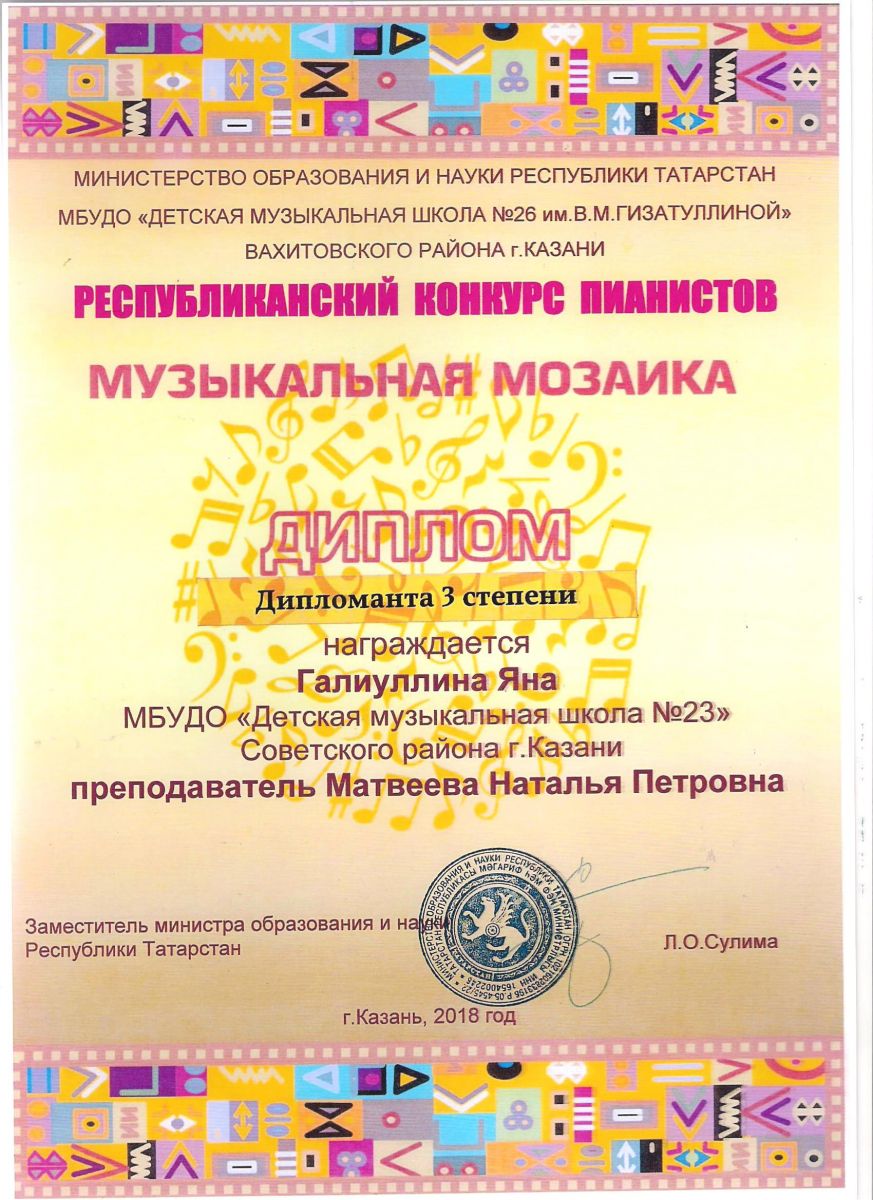 Республиканский конкурс пианистов "Музыкальная мозаика" - Диплом дипломанта 3 степени - Галиуллина Яна (преподаватель: Матвеева Н.П.)