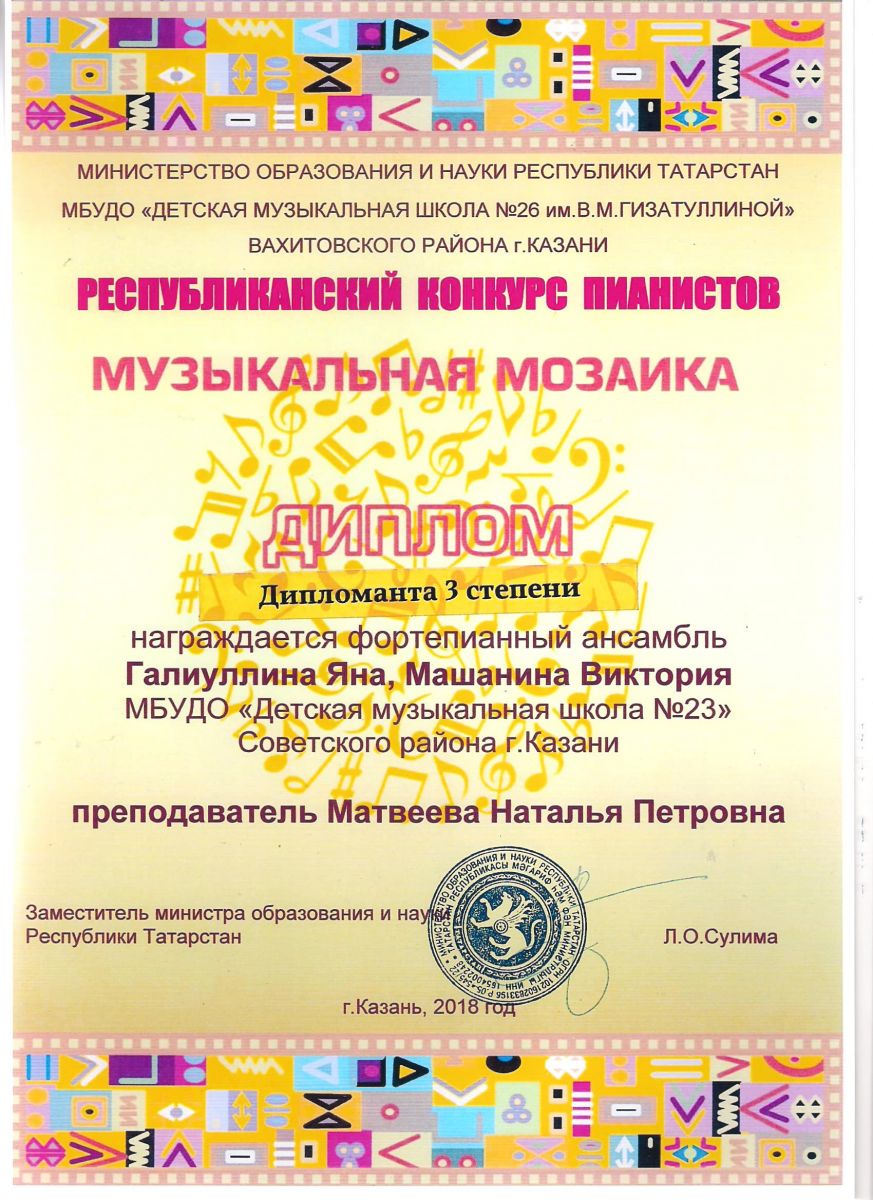 Республиканский конкурс пианистов "Музыкальная мозаика" - Диплом дипломанта 3 степени - фортепианный ансамбль: Галиуллина Яна, Машанина Виктория (преподаватель: Матвеева Н.П.)