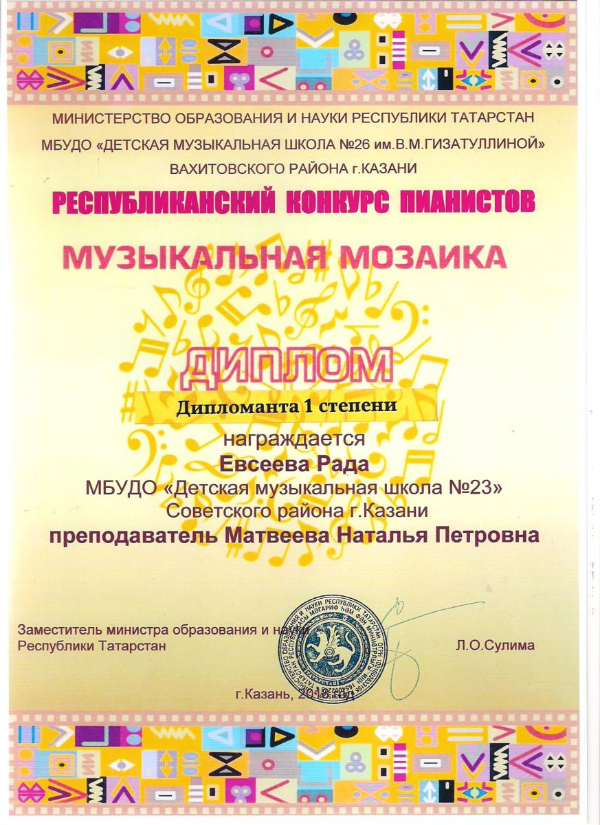 Республиканский конкурс пианистов "Музыкальная мозаика" - Диплом дипломанта 1 степени - Евсеева Рада (преподаватель: Матвеева Н.П.)