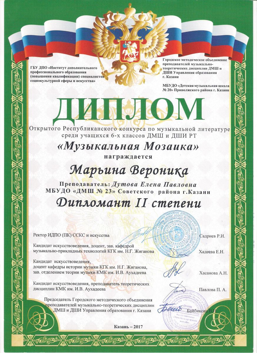 Открытый Республиканский конкурс по музыкальной литературе среди учащихся 6-х классов ДМШ и ДШИ РТ "Музыкальная мозаика" - Диплом дипломанта 2 степени - Марьина Вероника (преподаватель: Дутова Е.П.)