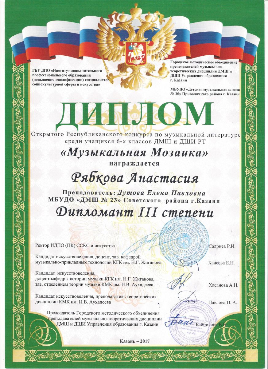 Открытый Республиканский конкурс по музыкальной литературе среди учащихся 6-х классов ДМШ и ДШИ РТ "Музыкальная мозаика" - Диплом дипломанта 3 степени - Рябкова Анастасия (преподаватель: Дутова Е.П.)