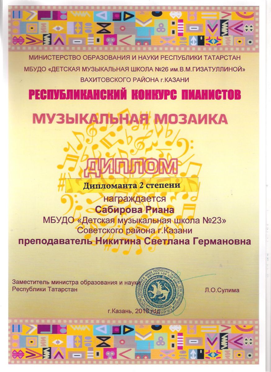 Республиканский конкурс пианистов "Музыкальная мозаика" - Диплом дипломанта 2 степени - Сабирова Риана (преподаватель: Никитина С.Г.)