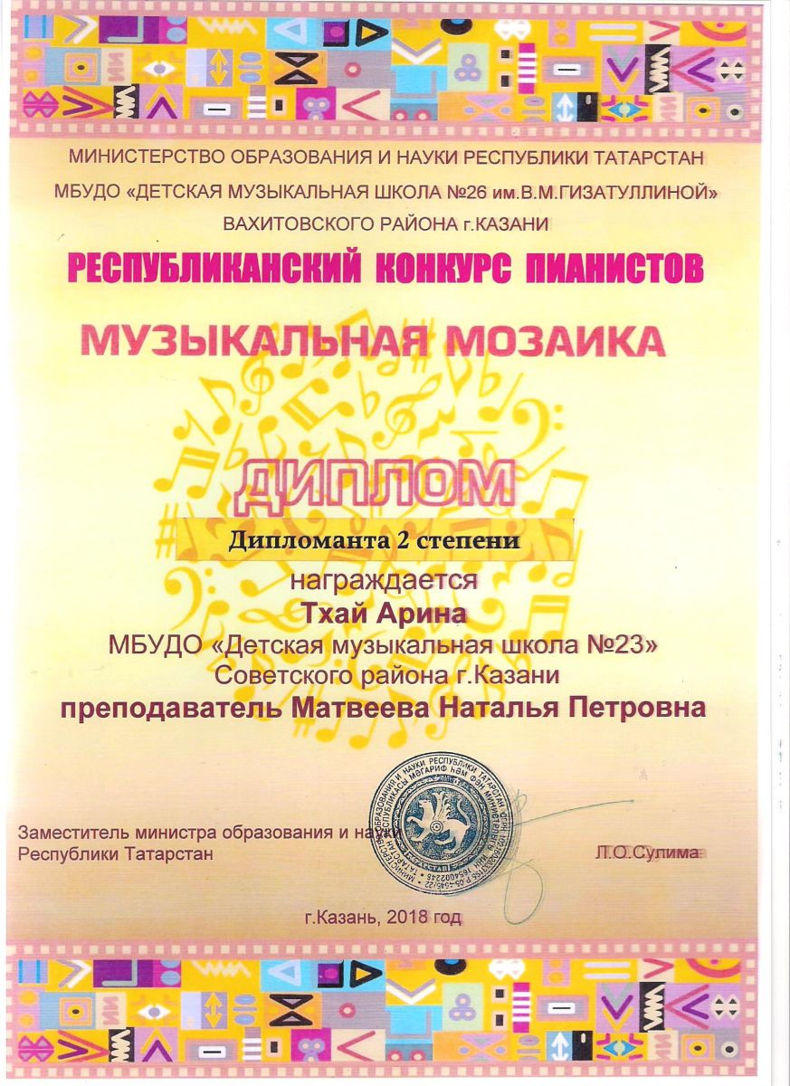 Республиканский конкурс пианистов "Музыкальная мозаика" - Диплом дипломанта 2 степени - Тхай Арина (преподаватель: Матвеева Н.П.)