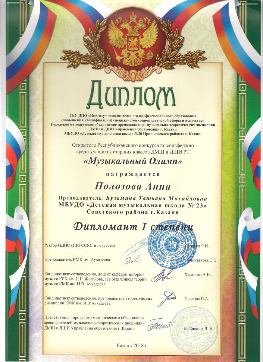 Открытый Республиканский конкурс по сольфеджио среди учащихся старших классов ДМШ и ДШИ РТ "Музыкальный Олимп" - Диплом дипломанта 1 степени - Полозова Анна (преподаватель: Кузьмина Т.М.)