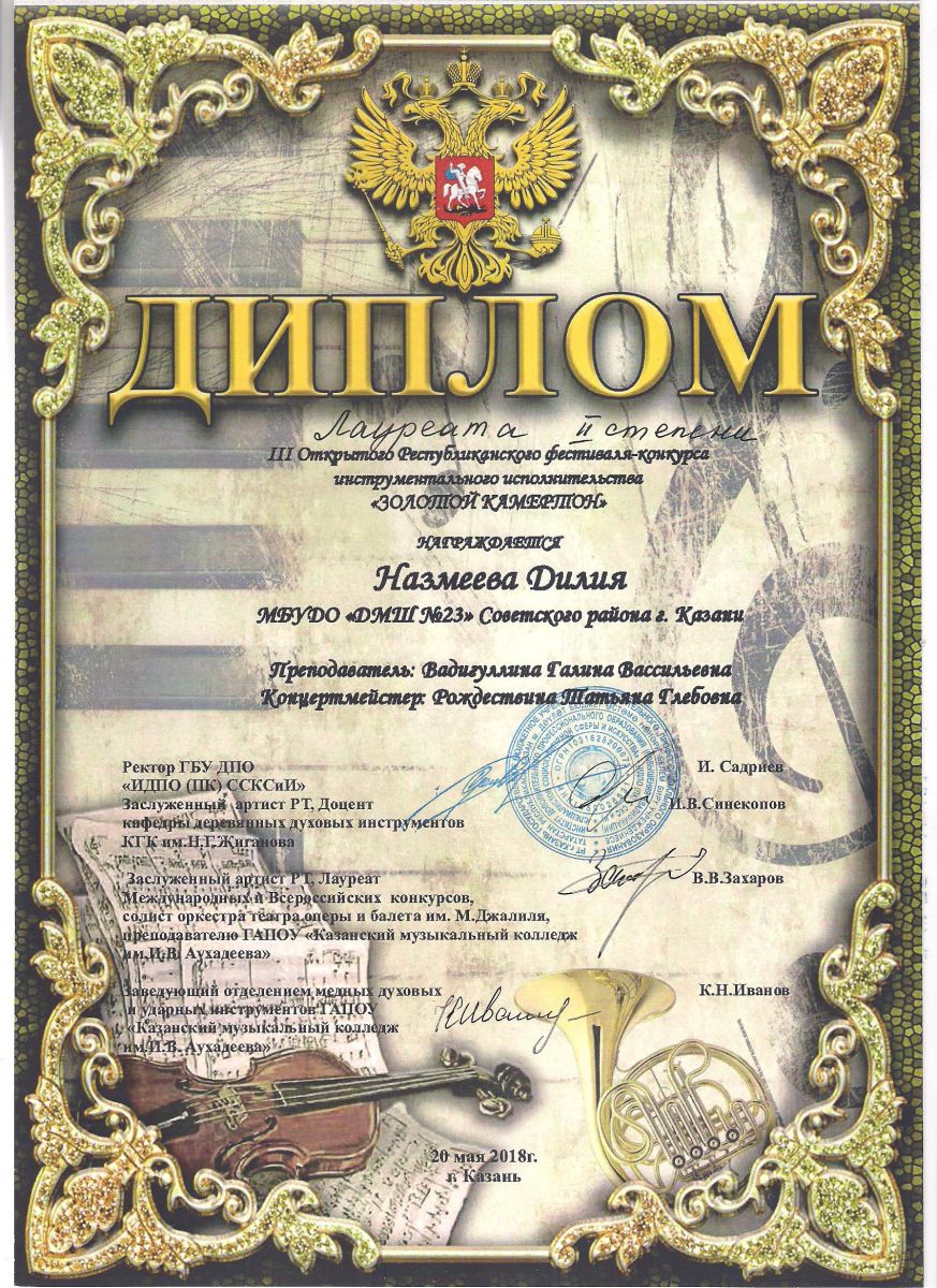 III Открытый Республиканский фестиваль-конкурс инструментального исполнительства "Золотой камертон" - Диплом лауреата 2 степени - Назмеева Дилия (преподаватель: Вадигуллина Г.В., концертмейстер: Рождествина Т.Г.)