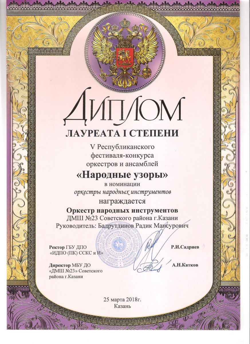 V Республиканский фестиваль-конкурс оркестров и ансамблей "Народные узоры" - Диплом лауреата 1 степени - Оркестр народных инструментов (руководитель: Бадрутдинов Р.М.)