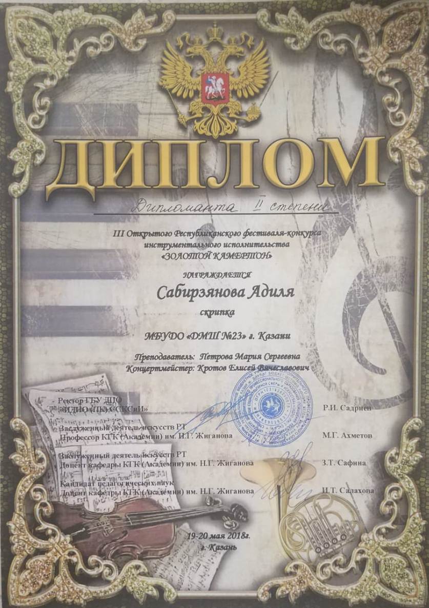 III Открытый Республиканский фестиваль-конкурс инструментального исполнительства "Золотой камертон" - Диплом дипломанта 2 степени - Сабирзянова Адиля (преподаватель: Петрова М.С.)