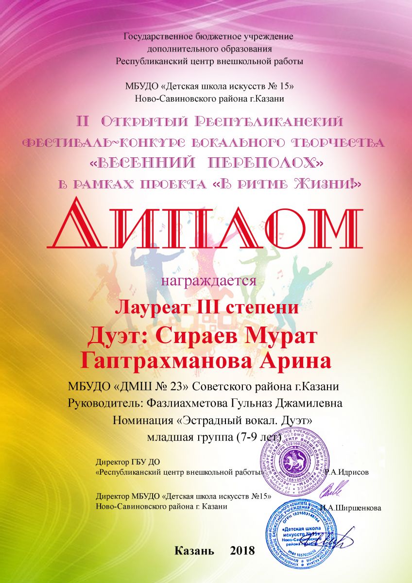 II Открытый Республиканский фестиваль-конкурс вокального творчества "Весенний переполох" - Диплом лауреата 3 степени - Дуэт: Сираев Мурат,  Гаптрахманова Арина (преподаватель: Фазлиахметова Г.Д.)