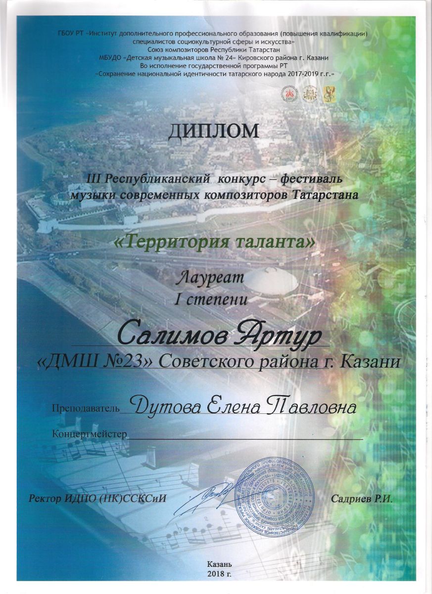 III Республиканский конкурс-фестиваль музыки современных композиторов Татарстана "Территория таланта" - Диплом лауреата 1 степени - Салимов Артур (преподаватель: Дутова Е.П.)