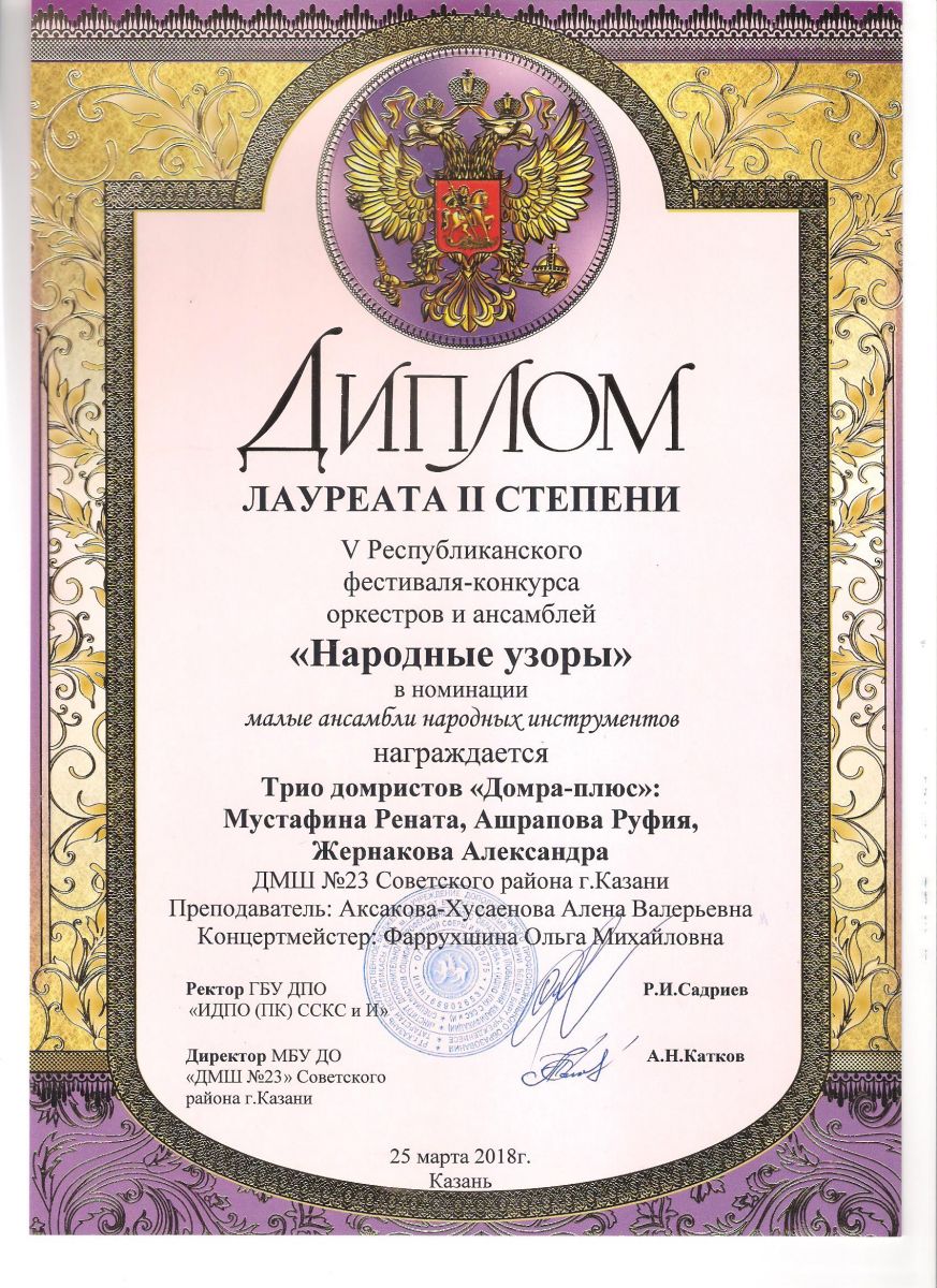 V Республиканский фестиваль-конкурс оркестров и ансамблей "Народные узоры" - Диплом лауреата 2 степени - Трио домристов "Домра-плюс" (преподаватель: Аксакова-Хусаенова А.В., концертмейстер: Фаррухшина О.М.)
