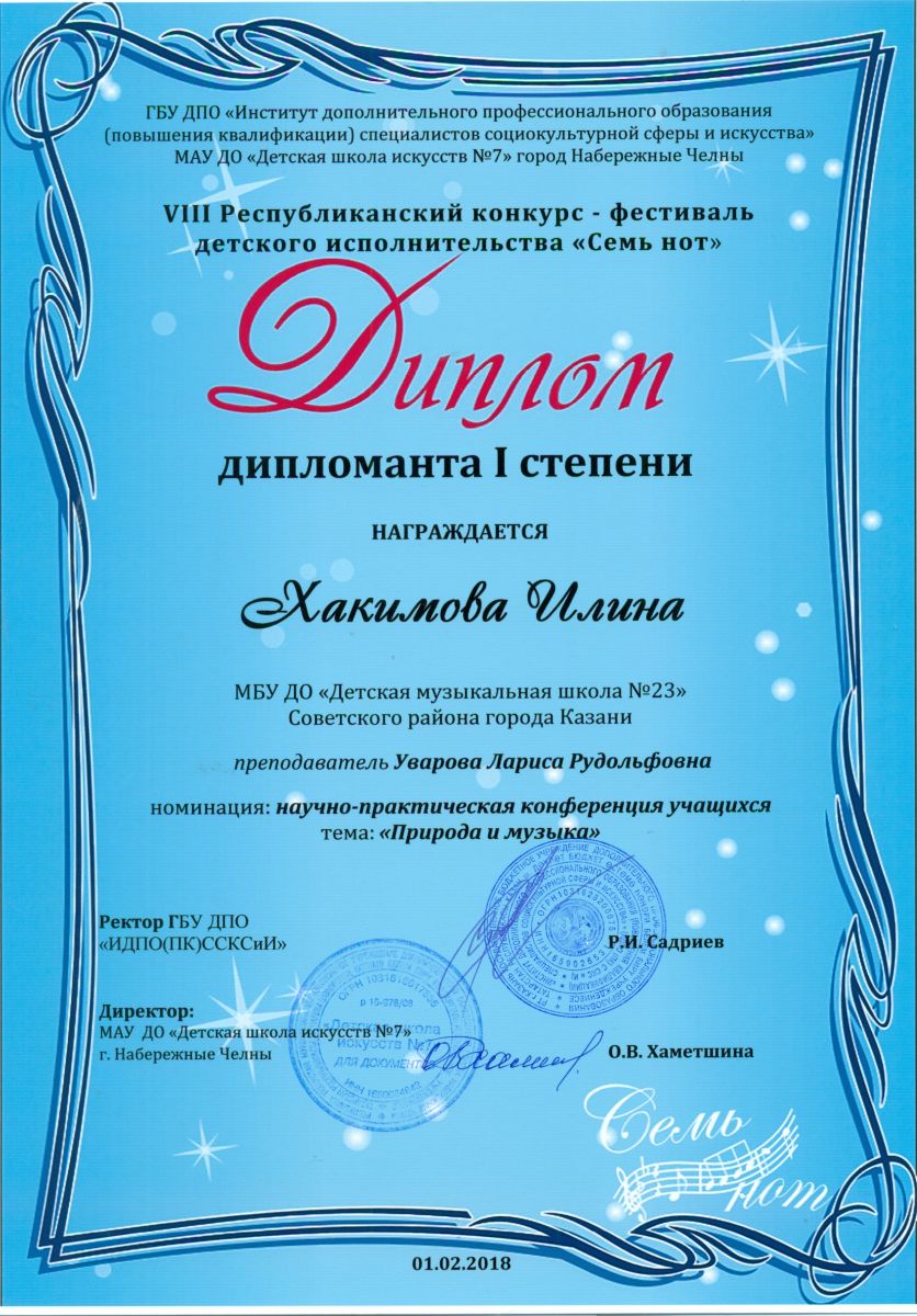 VIII Республиканский конкурс-фестиваль детского исполнительства "Семь нот" - Диплом дипломанта 1 степени - Хакимова Илина (преподаватель: Уварова Л.Р.)