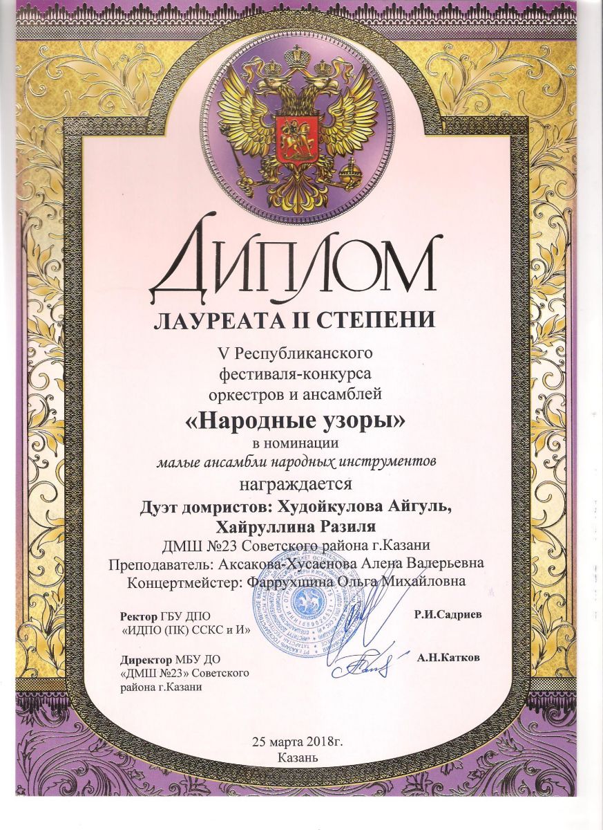 V Республиканский фестиваль-конкурс оркестров и ансамблей "Народные узоры" - Диплом лауреата 2 степени - Дуэт домристов: Худойкулова Айгуль, Хайруллина Разиля (преподаватель: Аксакова-Хусаенова А.В., концертмейстер: Фаррухшина О.М.)