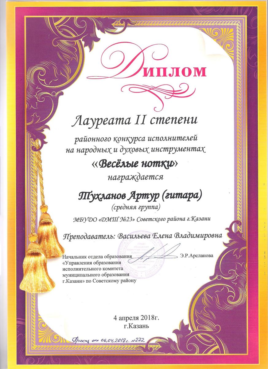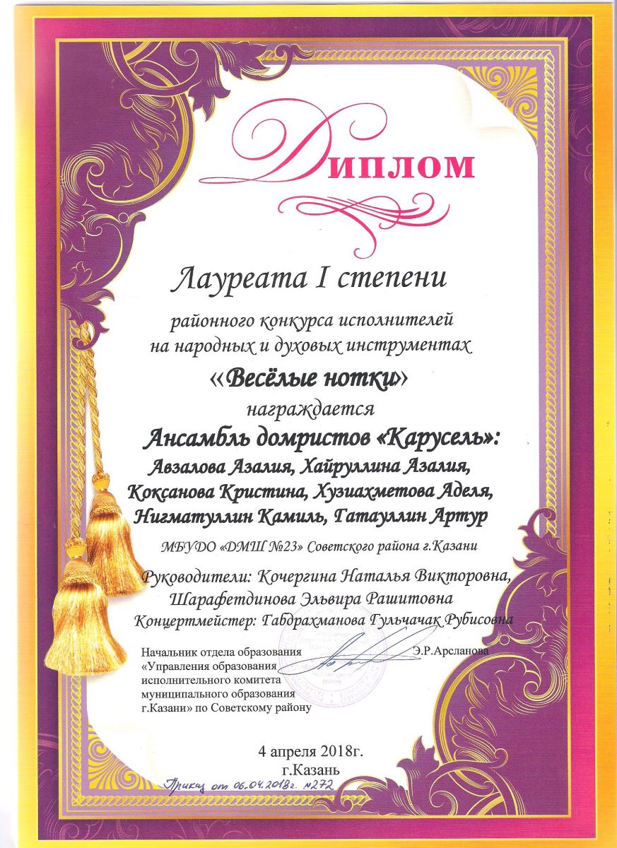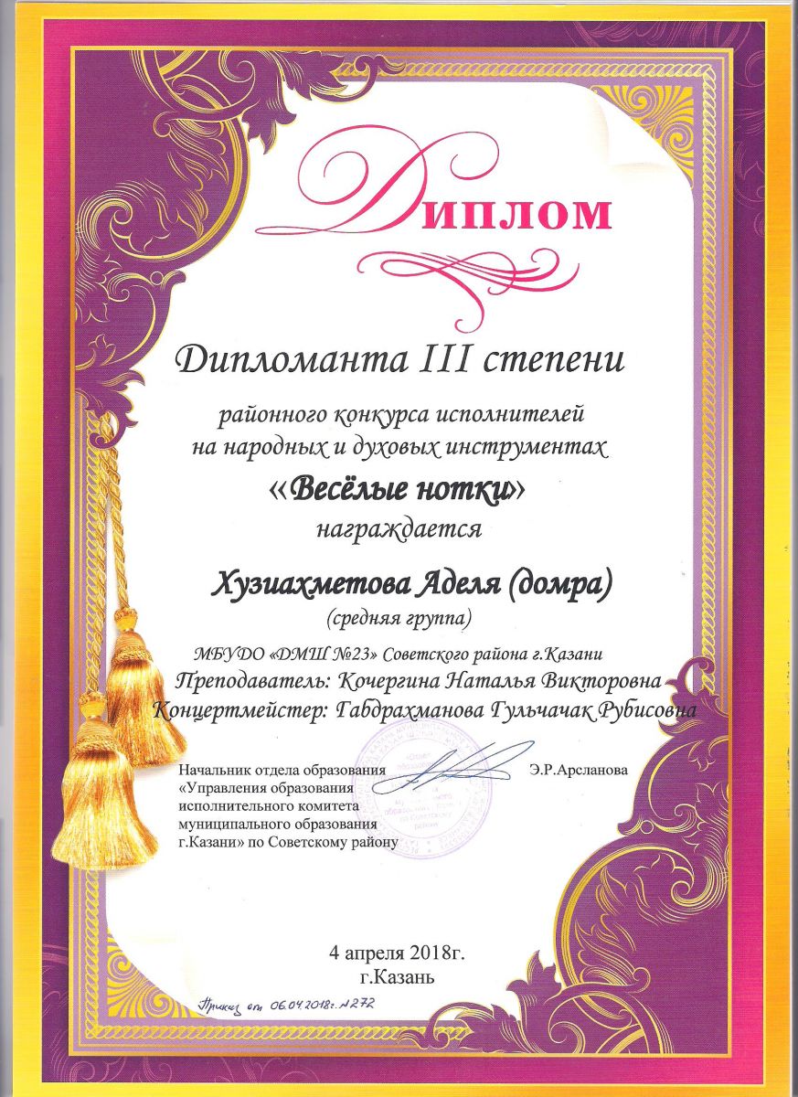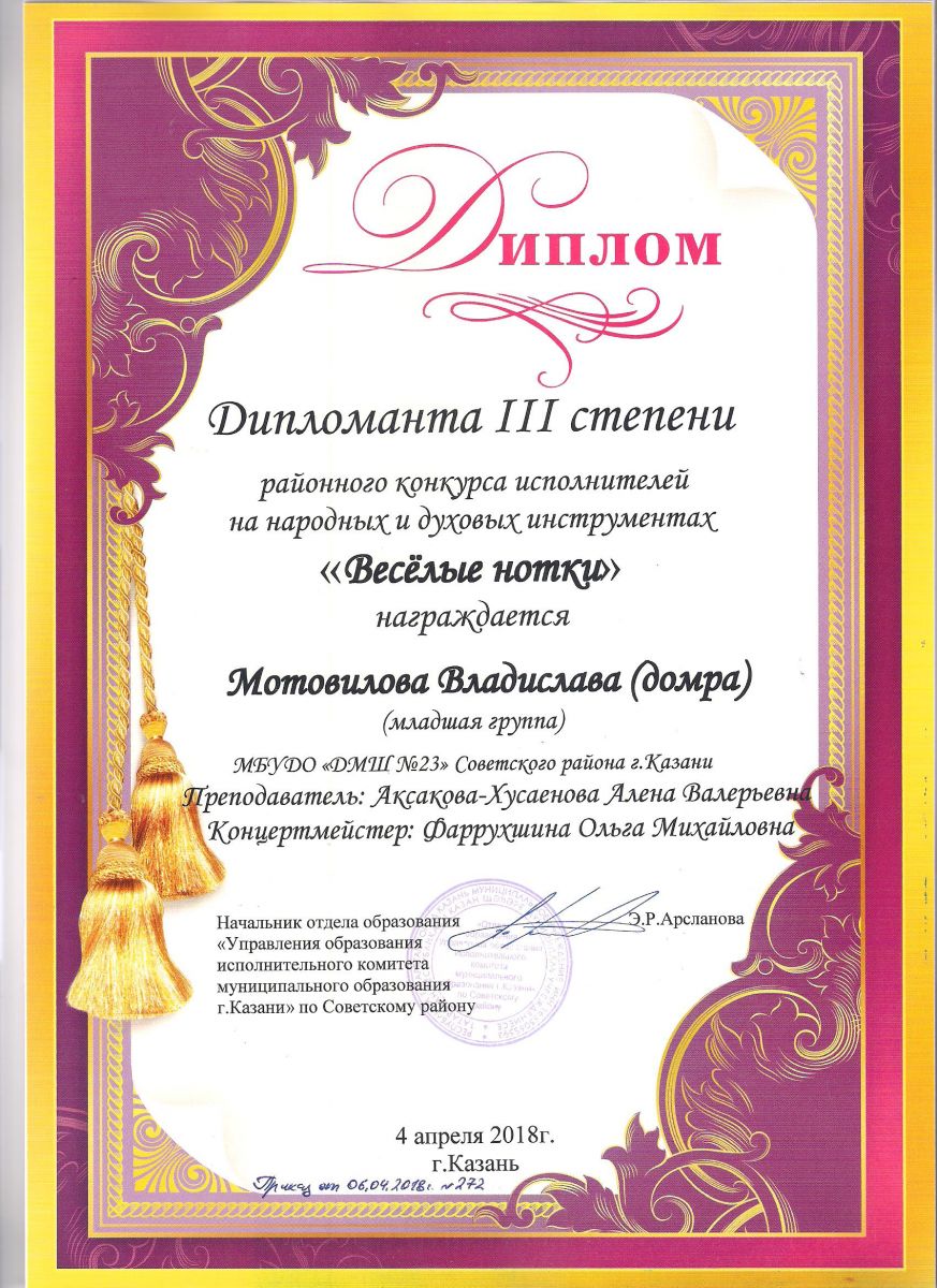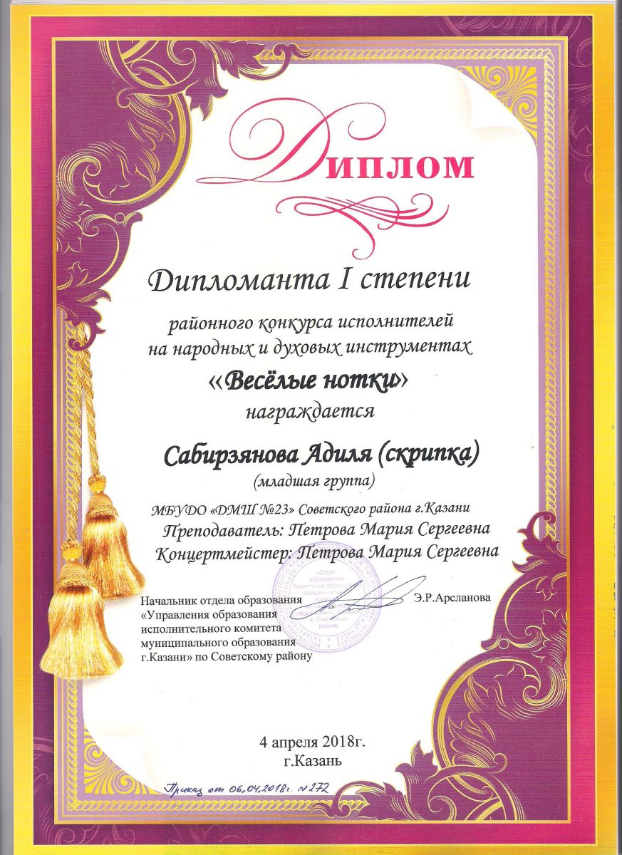 Районный конкурс исполнителей на народных и духовых инструментах "Весёлые нотки" - Диплом дипломанта 1 степени - Сабирзянова Адиля (преподаватель: Петрова М.С., концертмейстер: Петрова М.С.)