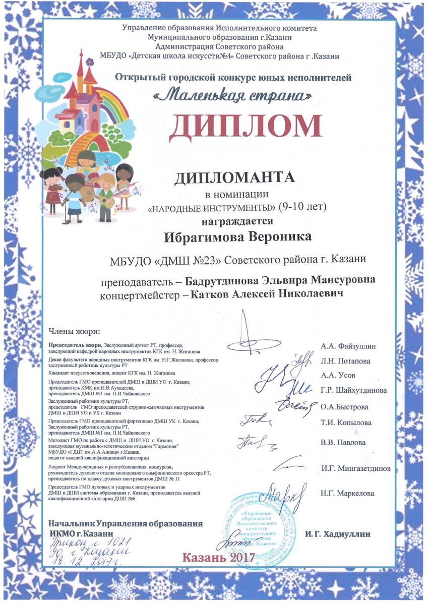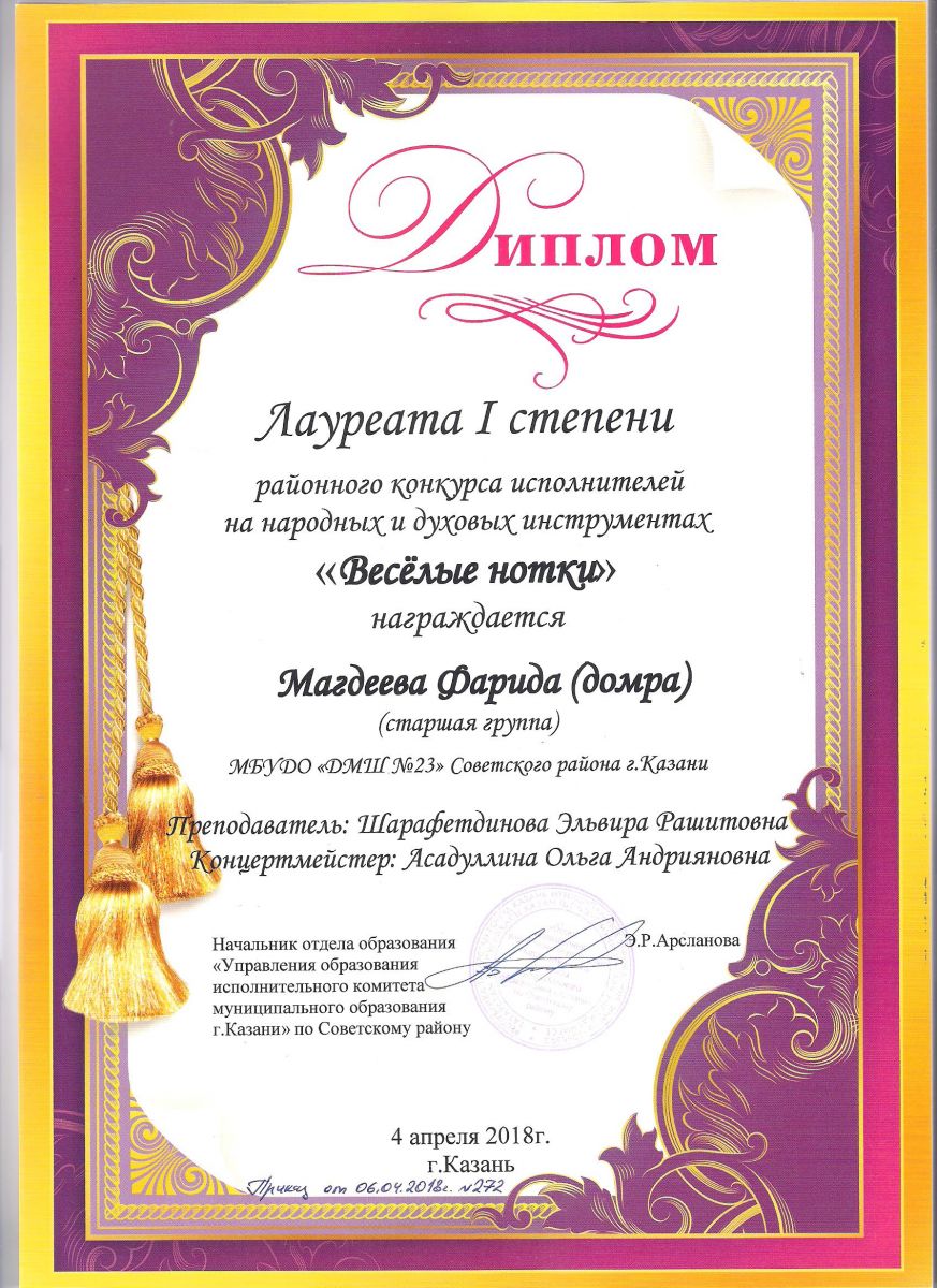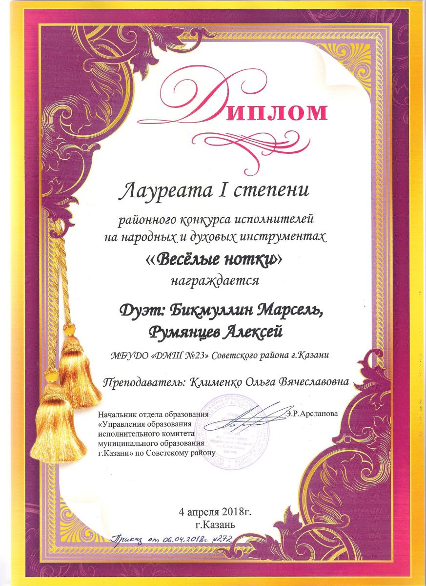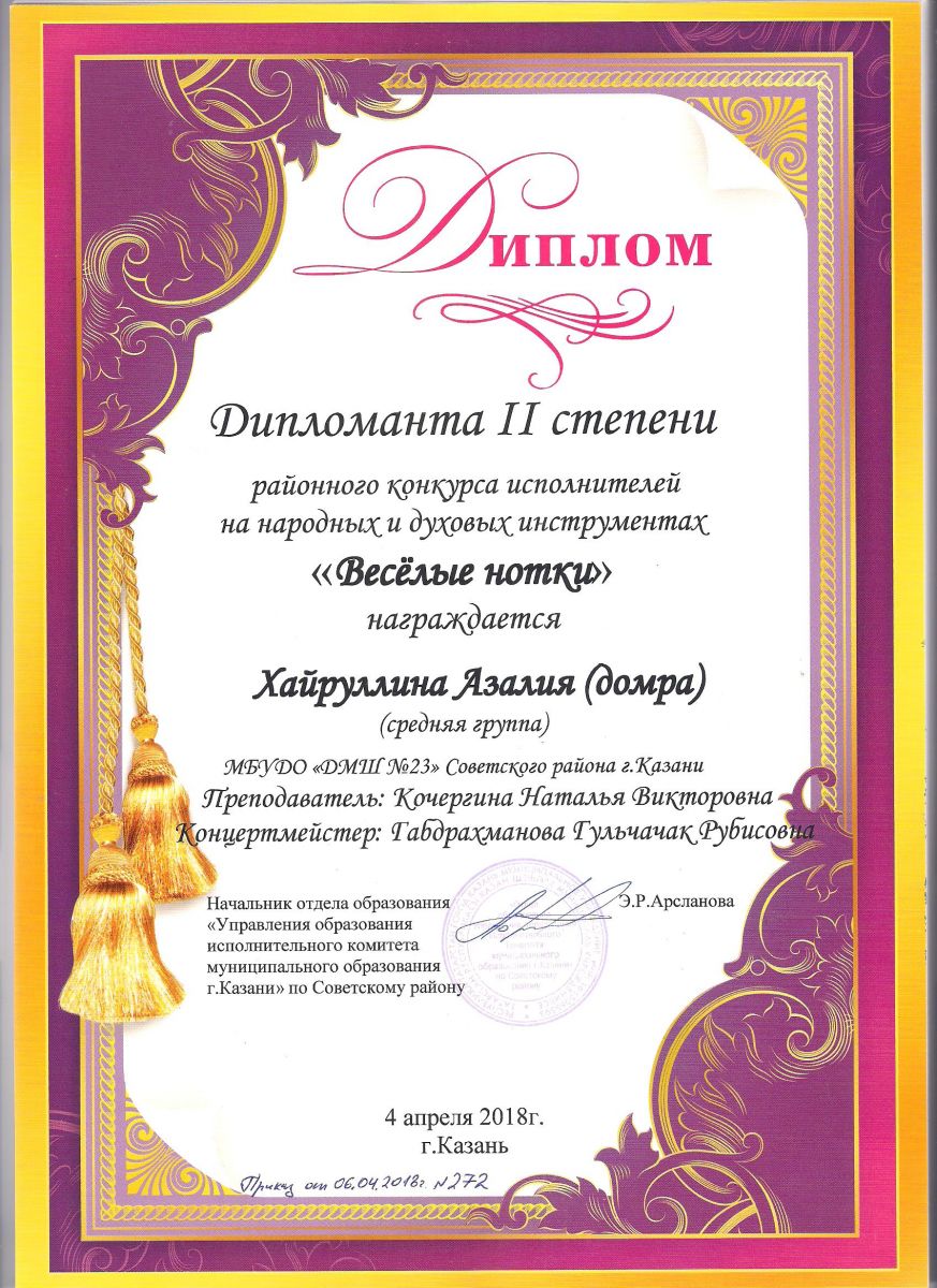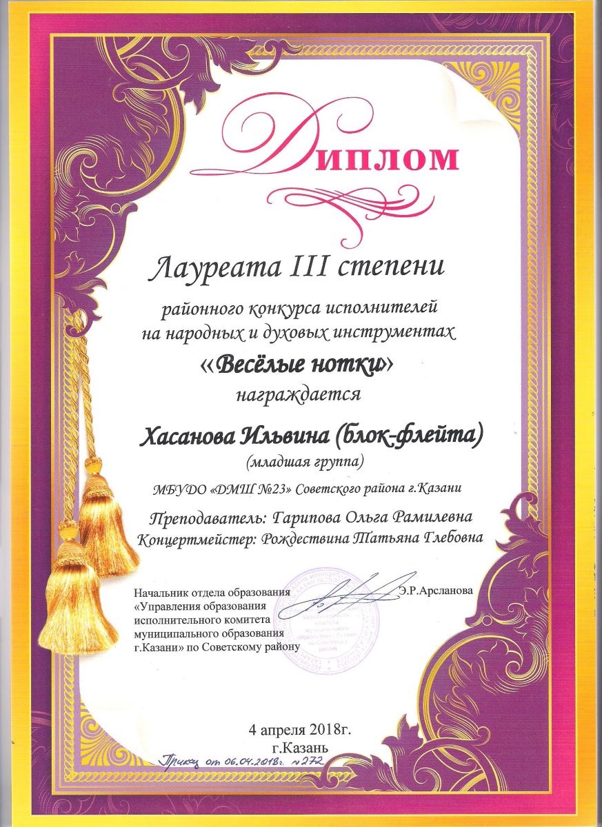 Районный конкурс исполнителей на народных и духовых инструментах "Весёлые нотки" - Диплом дипломанта 1 степени - Сабирзянова Адиля (преподаватель: Петрова М.С., концертмейстер: Петрова М.С.)