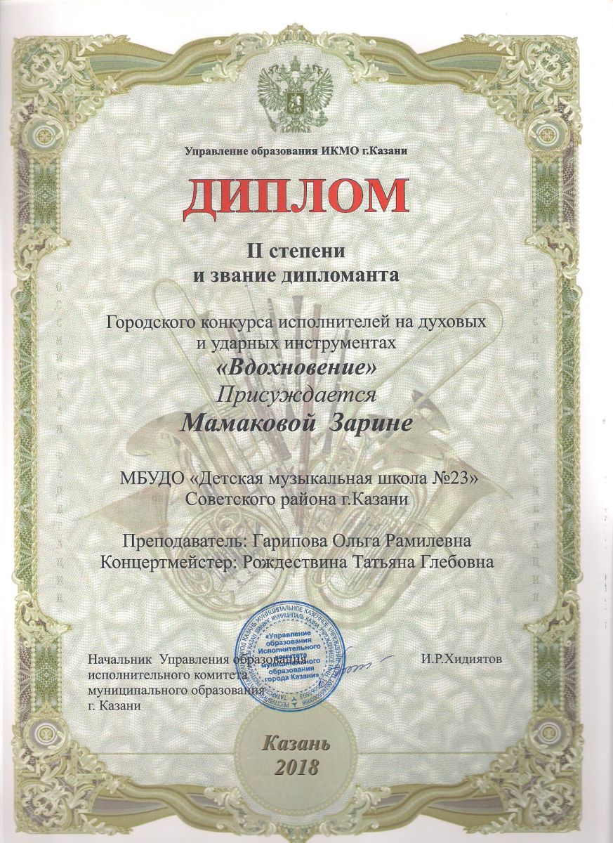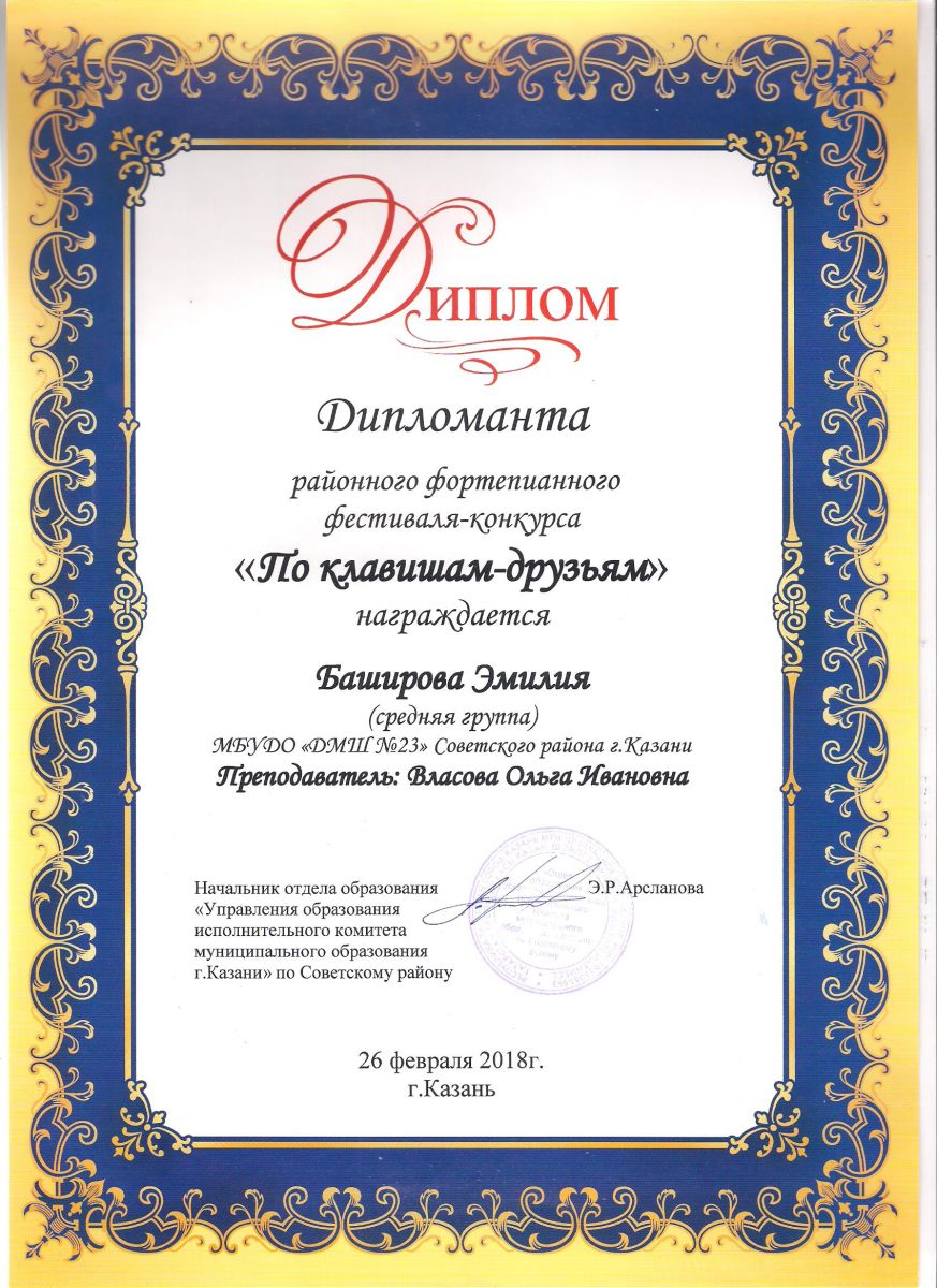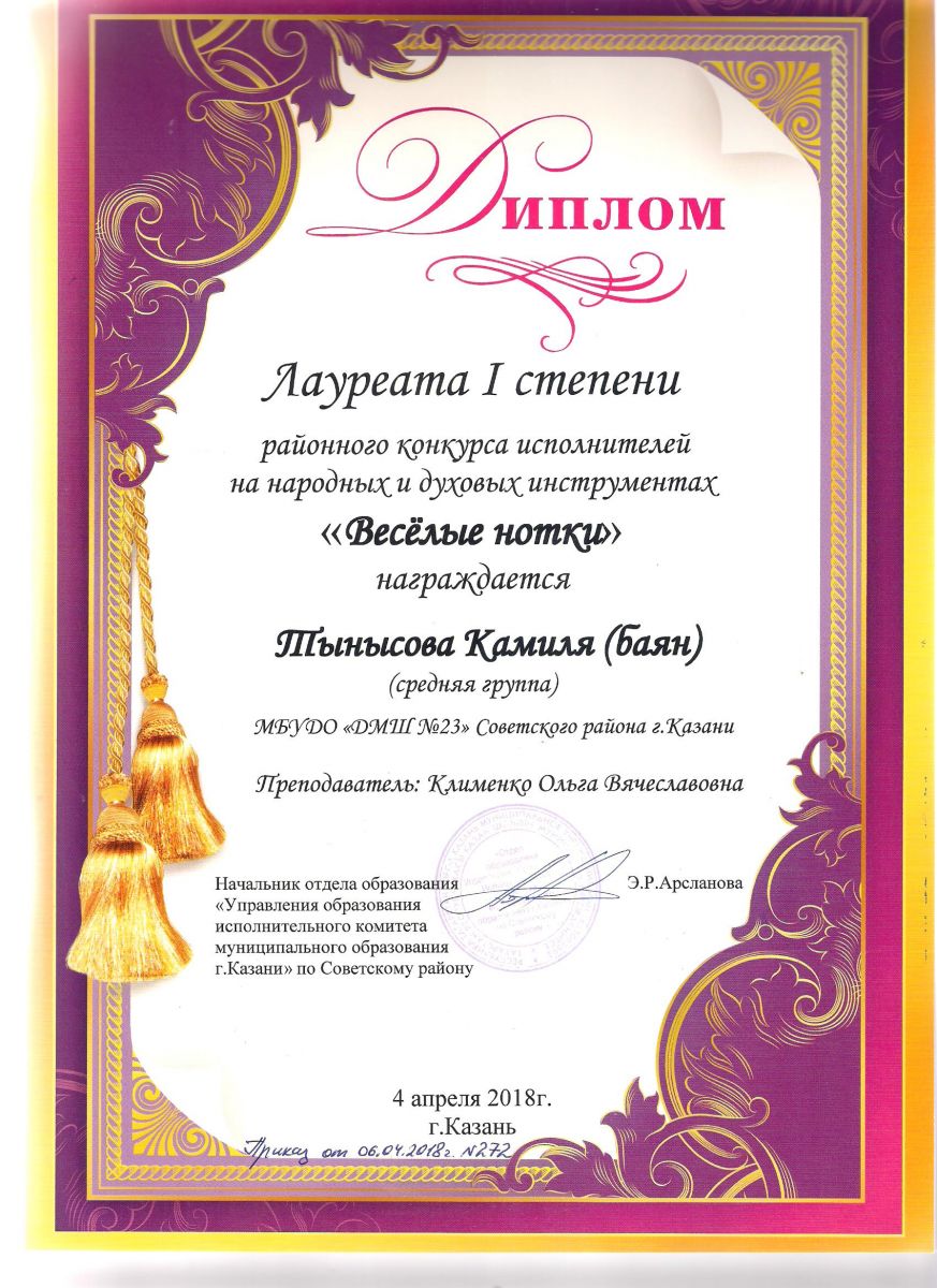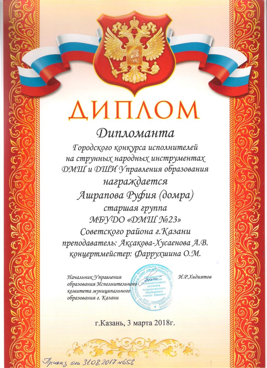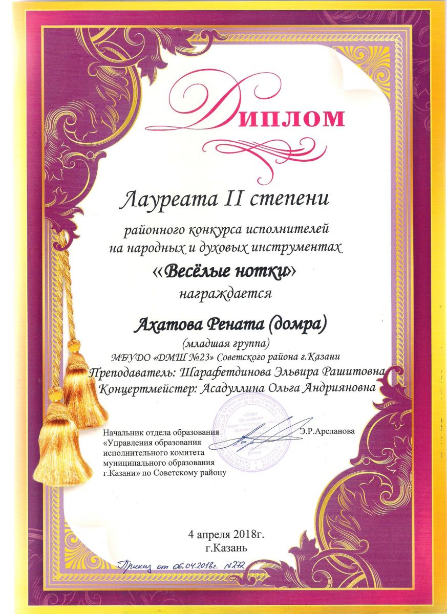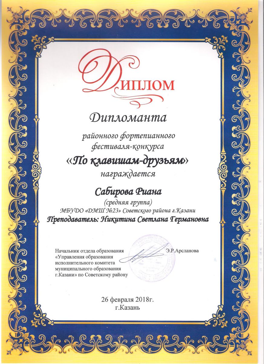 Районный конкурс исполнителей на народных и духовых инструментах "Весёлые нотки" - Диплом дипломанта 1 степени - Сабирзянова Адиля (преподаватель: Петрова М.С., концертмейстер: Петрова М.С.)