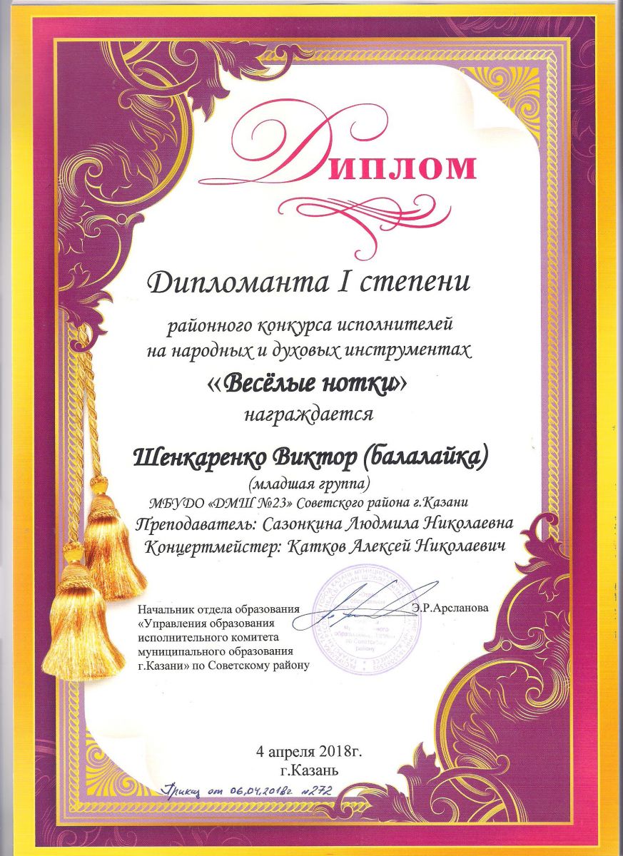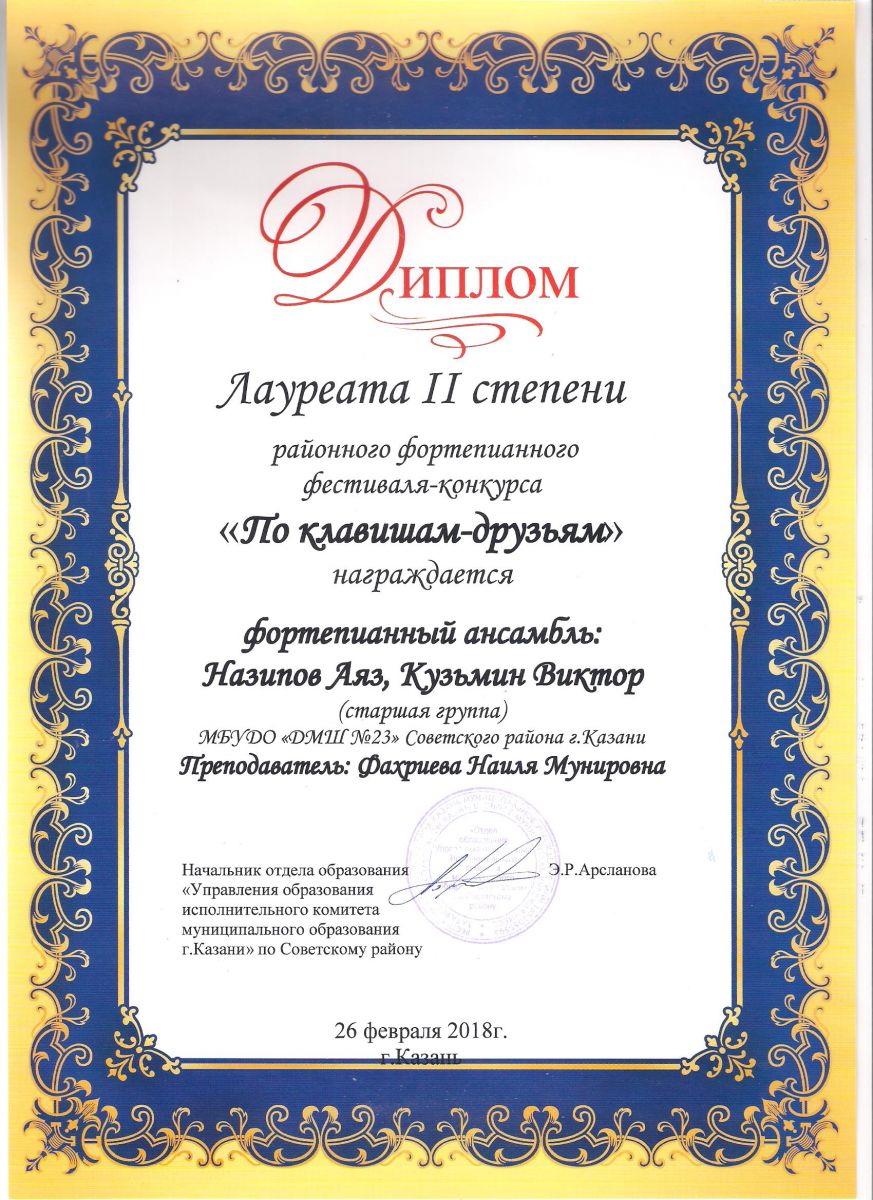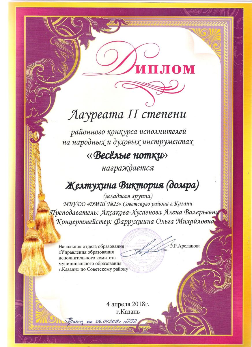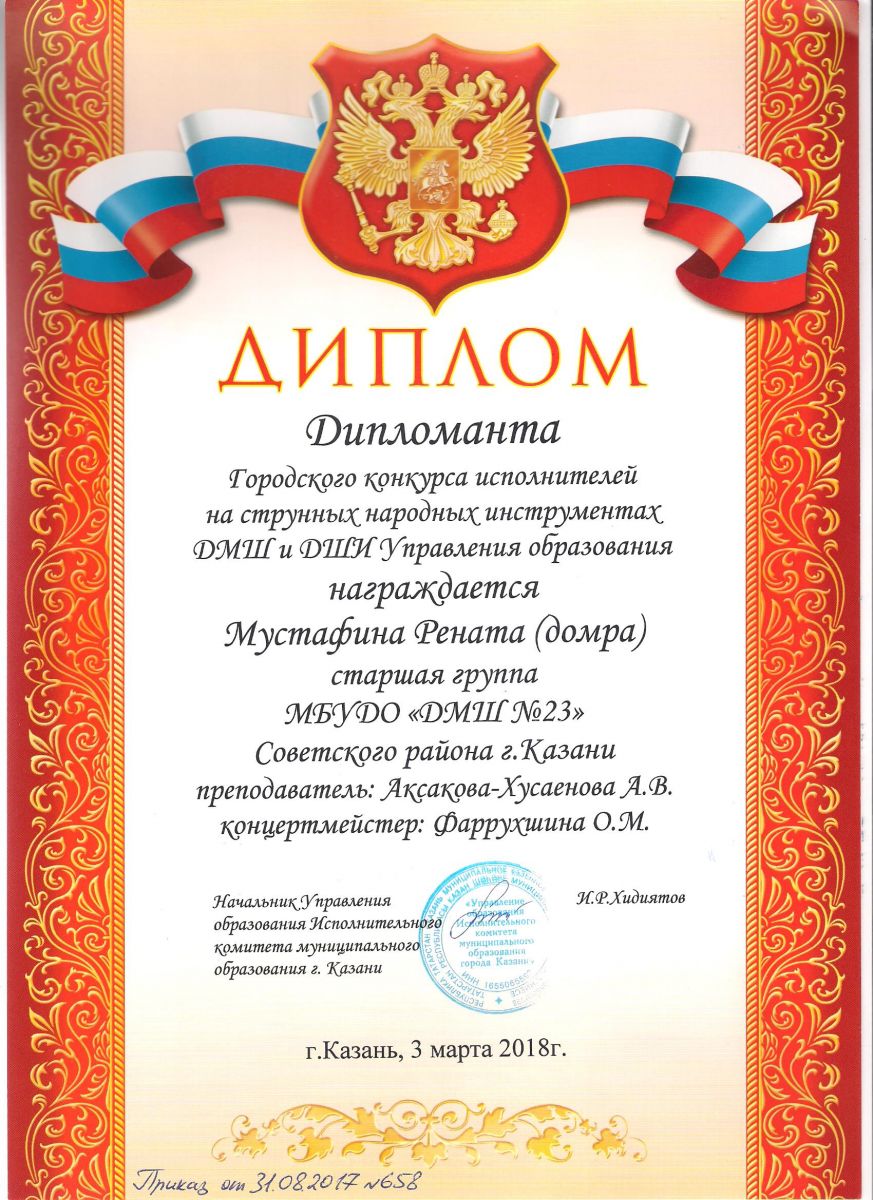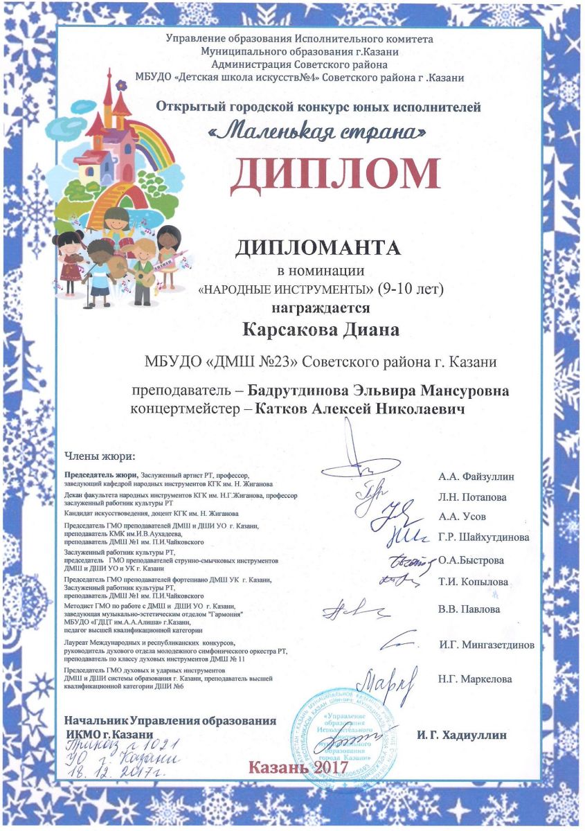 Районный конкурс исполнителей на народных и духовых инструментах "Весёлые нотки" - Диплом дипломанта 1 степени - Сабирзянова Адиля (преподаватель: Петрова М.С., концертмейстер: Петрова М.С.)