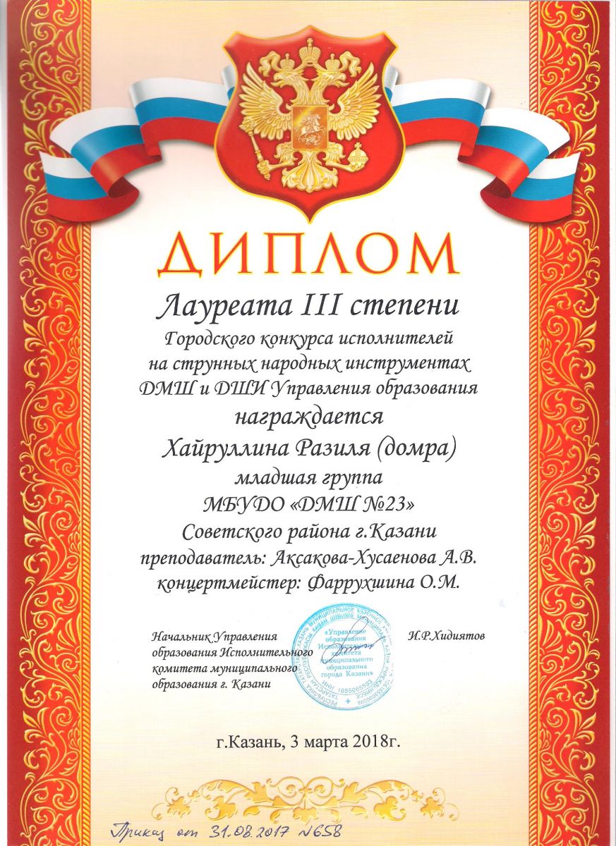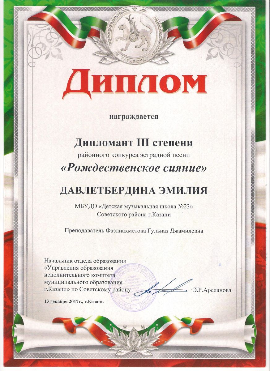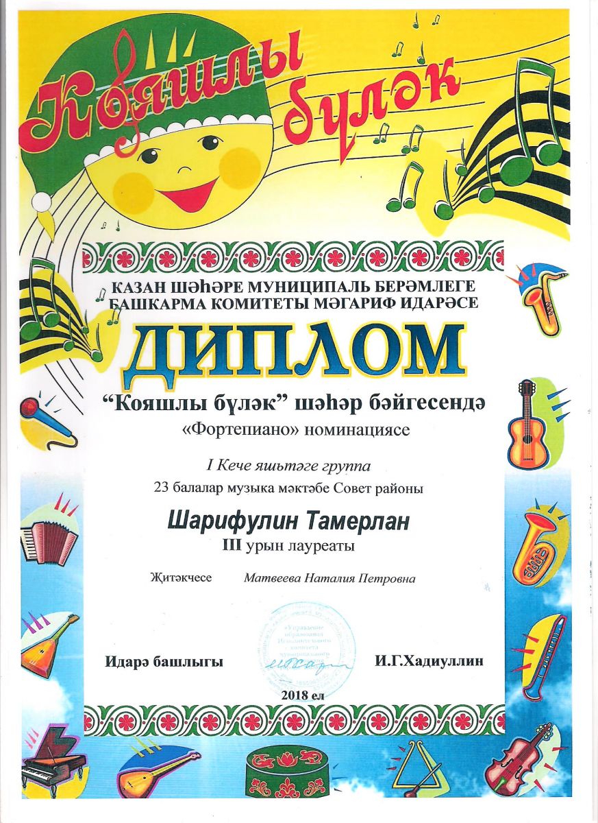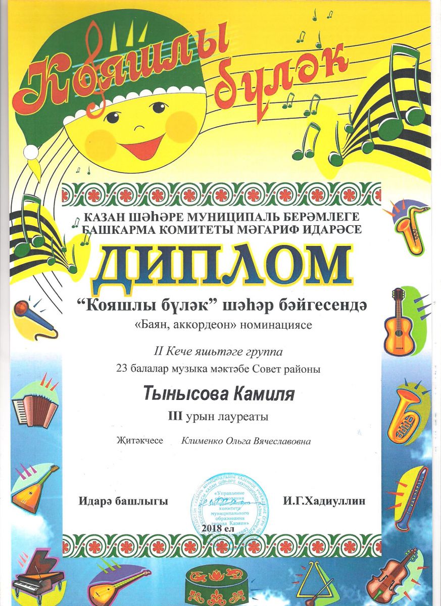 Городской конкурс татарской музыки "Кояшлы булэк" - Диплом лауреата 3 степени - Тхай Арина (преподаватель: Матвеева Н.П.)