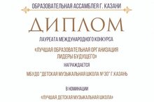 22 декабря 2017 г. в рамках Международной образовательной ассамблеи (г.Казань) состоялось награждение победителей Международного конкурса лучших образовательных учреждений и педагогов. Поздравляем школу, ставшей лауреатом в номинации "Лучшая музыкальная школа" и присвоеинием ей звания "Лучшая образовательная организация, лидеры будущего". Руководитель учреждения Камалова Ю.З. стала "Директором года 2017".