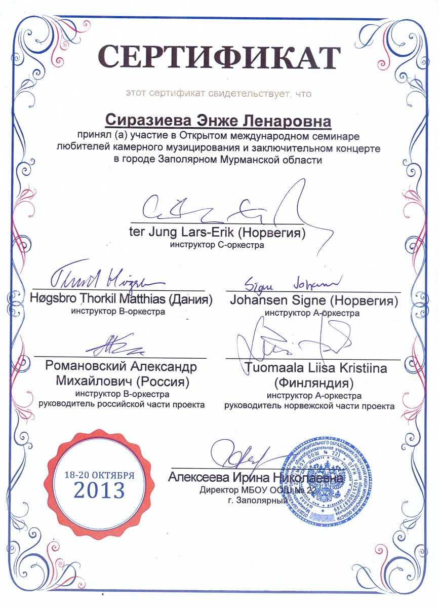 Международный семинар любителей музыкального музицирования – Сиразиева Энже – сертификат