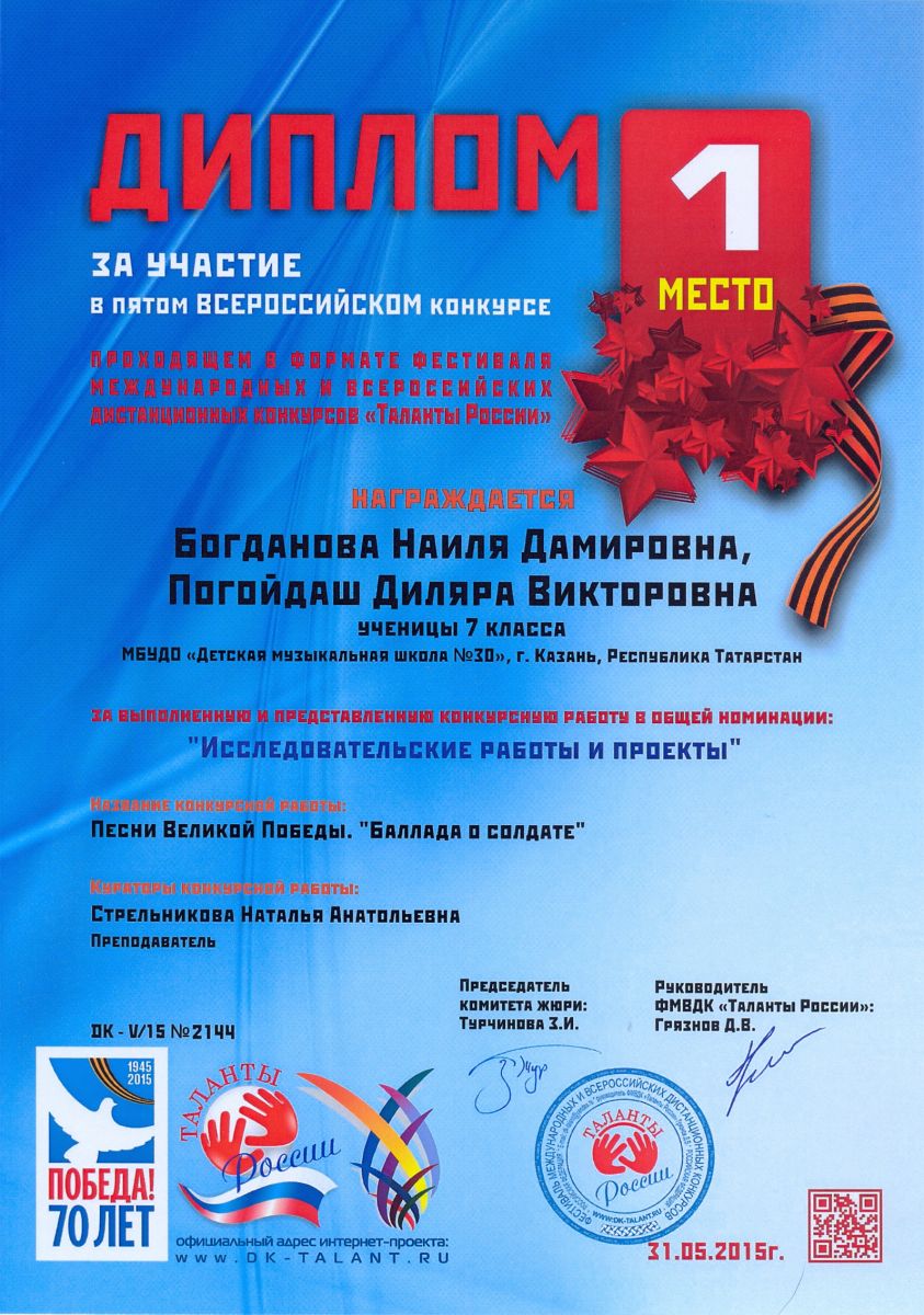V Всероссийский конкурс «Таланты России» - Богданова Наиля, Погойдаш Диляра - I место