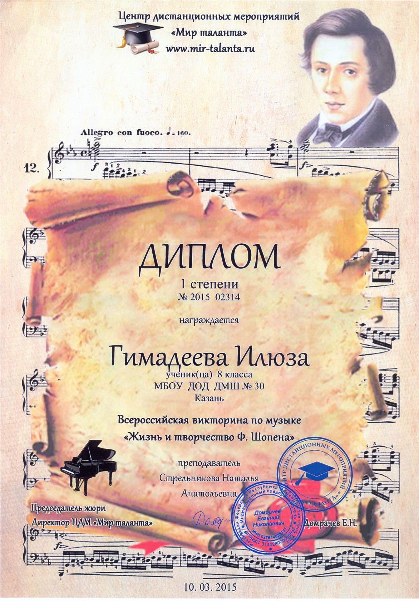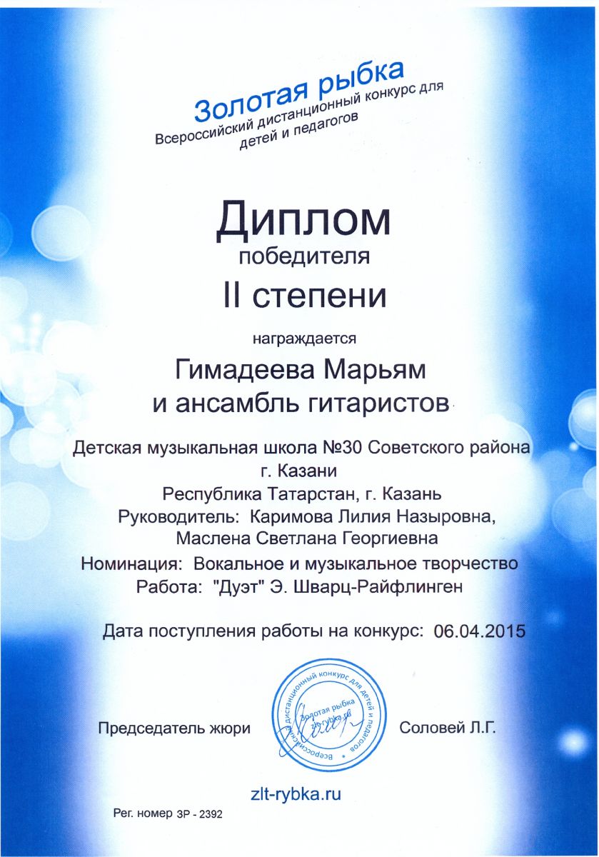 Всероссийская дистанционная олимпиада по музыке «Мир таланта» - Гимадеева Марьям – II место