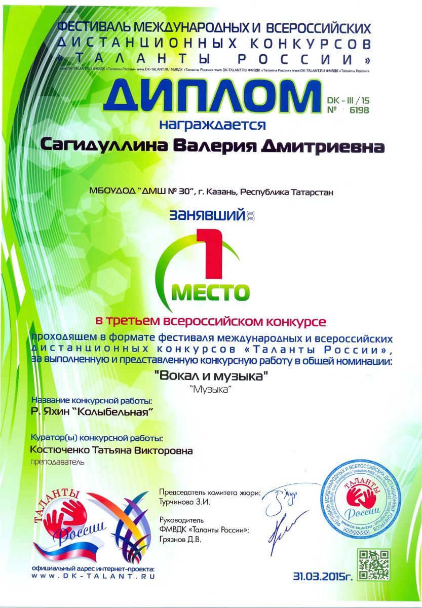 III Всероссийский дистанционный конкурс «Таланты России» - Сагидуллина Валерия - I место