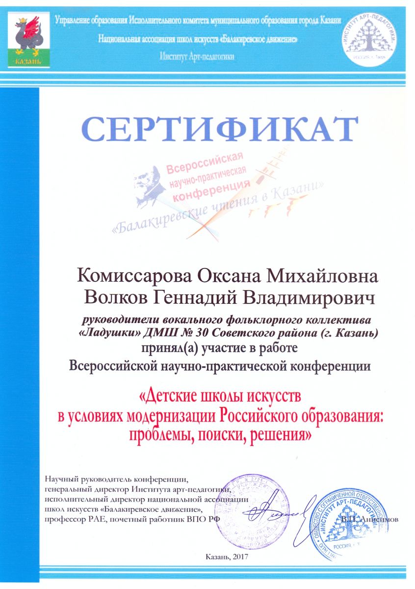 Всероссийская научно-практическая конференция "Детские школы искусств в условиях модернизации Российского образования: проблемы, поиски, решения" - Исхакова Ю.Н. - участник